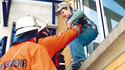 Fünf der acht Klassen verlassen das Gebäude sofort über die Feuertreppe. Die Kinder im südlichen Trakt um Konrektor Franz Kapinus und um Klassenlehrerin Silke Mittenmayer können das Treppenhaus nicht mehr passieren. Einer nach dem anderen, beruhigt Franz Kapinus die Jungs und Mädchen, während diese mit Hilfe der Wehrmänner aus dem Fenster steigen. Das war lustig, lacht Lea Baumgärtner. Klassenlehrerin Silke Mittenmayer hat indessen selbst die Initiative ergriffen. In ihrem Zimmer, in dem die Fenster teilweise kniehoch am Gehweg entlang liegen, ist das auch kein Problem. Doch Klasse 1 aus dem ersten Stock fehlt noch: Der Rauch im Treppenhaus versperrt den Weg zur Feuertreppe.