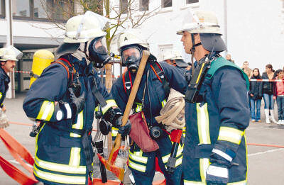 Von jetzt an geht alles blitzschnell. Die Mannschaft sitzt ab, Atemgeräte werden geschultert, Äxte gegriffen, Löschschläuche ausgerollt und Monturen angezogen. Zugführer Dirk Seufer instruiert den Angriffstrupp, zwei Feuerwehrleute, die als erste ins brennende Schulhaus eindringen. Mit einer Trage transportieren diese später einen Verletzten durchs Treppenhaus zum Ausgang und setzen ihn bei der Erstversorgungsstelle ab. Mittlerweile sind ein weiteres Löschgruppenfahrzeug und ein Drehleiterfahrzeug der Neckarsulmer Feuerwehr eingetroffen. Über die Leiter und den Rettungskorb gelangen eingeschlossene Schüler aus dem Musiksaal in Sicherheit. „Feuer schwarz, sieben Verletzte gerettet“, lautet die knappe Meldung von Dirk Seufer an Kommandant Jochim. Es ist 9.56 Uhr.