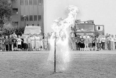 „Ihr wisst sicher alle, wie Pommes Frites hergestellt werden. Kennt ihr aber auch die Gefahren im Umgang mit heißem Fett?“, regte Beck die Neugier der Kinder an. Auf der Grünfläche beim Pausenhof hatten die Blauröcke eine Vorrichtung aufgebaut, die einem Gartengrill ähnlich sah. Mit einem Gasbrenner erhitzte Andreas Beck einen halben Liter Fett bis über den Siedepunkt hinaus. Sein Kollege Felix Winterholer zog an einem Seil und ein kleiner Becher Wasser ergoss sich in das Fett. Die Explosionsflamme erreichte fast die Höhe des Schulgebäudes. „Mensch, war des toll“, entfuhr es den Zuschauern. Beck wiederholte das kleine Flammeninferno nochmals mit dem gleichen Effekt.