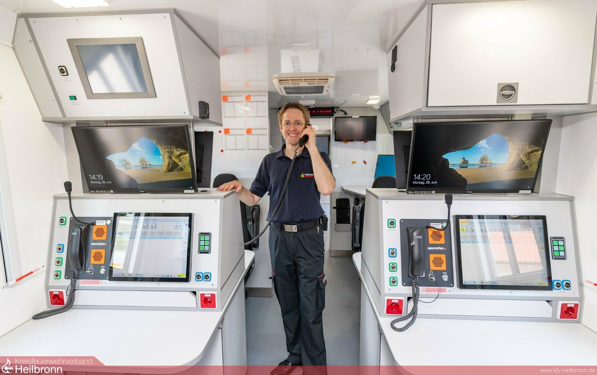 Die Fernmeldegruppe im abtrennbaren Bereich übernimmt die Kommunikation nach außen, mit den Einsatzkräften, der Integrieren Leitstelle oder sonstigen Stellen. Touchbildschirme fürs Funken und Telefonieren, Headsets, analoge Funkgeräte und digitale für das künftige System, mobiler und satellitenbasierter Internetzugang sowie Telefonie, zur Absicherung unterschiedliche Provider, zwei Serverschränke, zwei Funkmasten, Drucker und Scanner – es fehlt an nichts. Mit einem eigenen Stromerzeuger ist das ELW2 autark. Tragbare Telefone, Laptops und Tablets lassen sich für eine Einsatzzentrale in einem Gebäude einpacken. Dann wird das Spezialfahrzeug zum Übertragungswagen, dessen Technik von den Arbeitsplätzen fernbedient wird.