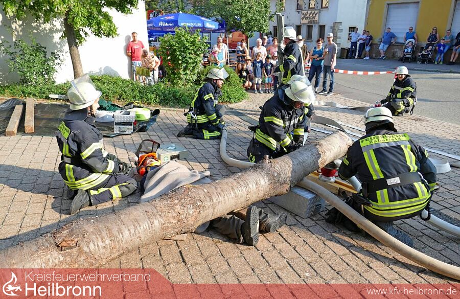 Schnell ist die Strategie festgelegt. Ein Schlauch wird unter dem Baumstamm durchgeführt und mit Wasser befüllt. So wird der Stamm angehoben und unterbaut. Über die Unterbauung wird erneut ein Schlauch gelegt und der Stamm weiter angehoben. Dies wiederholt sich so oft, bis die verletzte Person unter dem Stamm hervorgezogen werden kann. Nach weniger als zehn Minuten ist die Übung erfolgreich beendet.