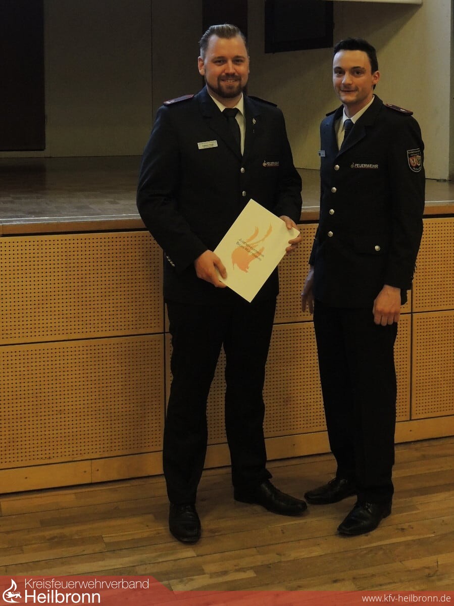 Im Anschluss gab es noch zwei besondere Ehrungen. Der Kreisjugendfeuerwehrwart Timo Kraft konnte auf Vorschlag des Feuerwehrausschusses den seitherigen Jugendfeuerwehrwart der Feuerwehr Ilsfeld, Fabian Vogt, für seine Verdienste mit der Ehrennadel der Jugendfeuerwehr Baden-Württemberg in Silber auszeichnen. Für Martin Kuhmann, den stellvertretenden Kreisfeuerwehrverbandsvorsitzenden, war es im Anschluss eine besondere Ehre die Ehrennadel des Kreisfeuerwehrverbandes Heilbronn an Evelyn Schneider, die langjährige Leiterin und Stabführerin des Spielmannszuges Ilsfeld zu verleihen. Mit der Ehrennadel des Kreisfeuerwehrverbandes Heilbronn werden verdiente Feuerwehrleute und solche Persönlichkeiten ausgezeichnet, die sich jahrelang für die Belange der Feuerwehren im Stadt- und Landkreis Heilbronn eingesetzt haben. Martin Kuhmann führte weiter aus, dass Evelyn Schneider der Feuerwehr Ilsfeld ja erhalten bleibt. Sie engagiert sich weiter in der Kindergruppe der Jugendfeuerwehr. Außerdem leitet sie die Theatergruppe der Feuerwehr Ilsfeld und schreibt die Theaterstücke selbst. Sowohl Fabian Vogt als auch Evelyn Schneider erhielten von allen Anwesenden einen langanhaltenden Applaus.