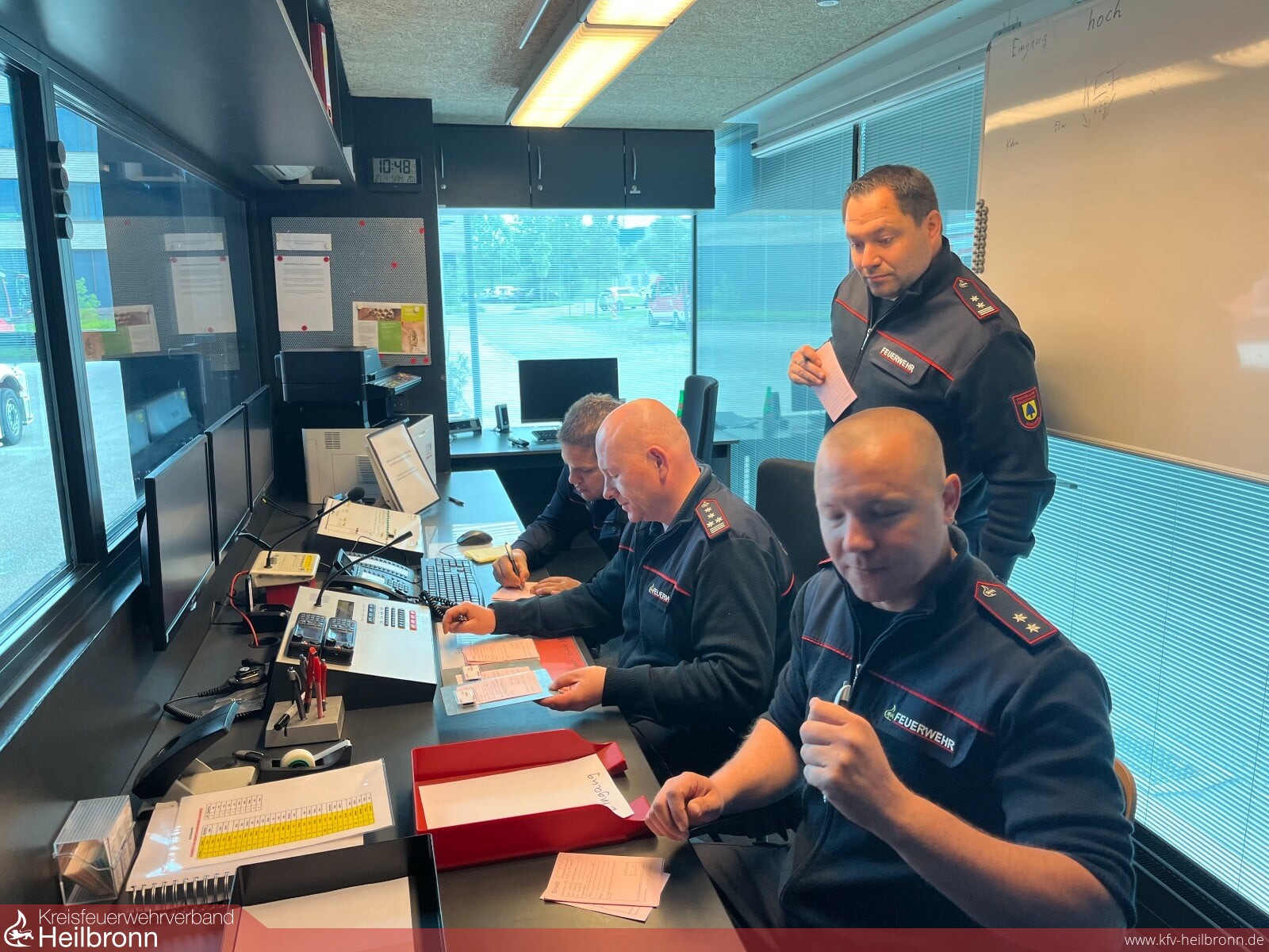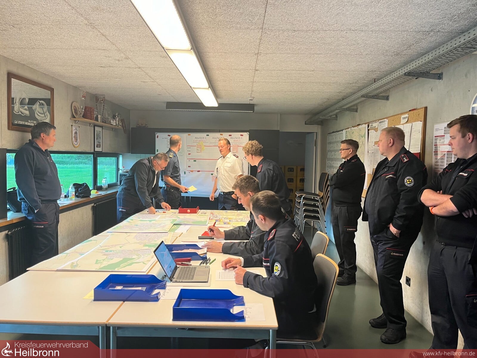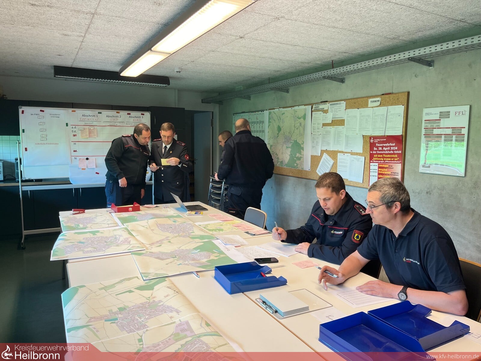 In praktischen Übungen wurde dann eine Unwetterlage mit einer Vielzahl von Einsätzen simuliert, die von einer Führungsgruppe im Führungshaus (Fernmeldebereich und Führungsraum) abgearbeitet werden musste. Durch die Einbindung der Fernmeldegruppe mit ELW 2 des Landkreises, welche die Einsätze über verschiedene Medien einspielte und auch die Rolle der eingesetzten Einsatzfahrzeuge übernahm, konnte dabei eine sehr realitätsnahe Übungssituation erreicht werden.