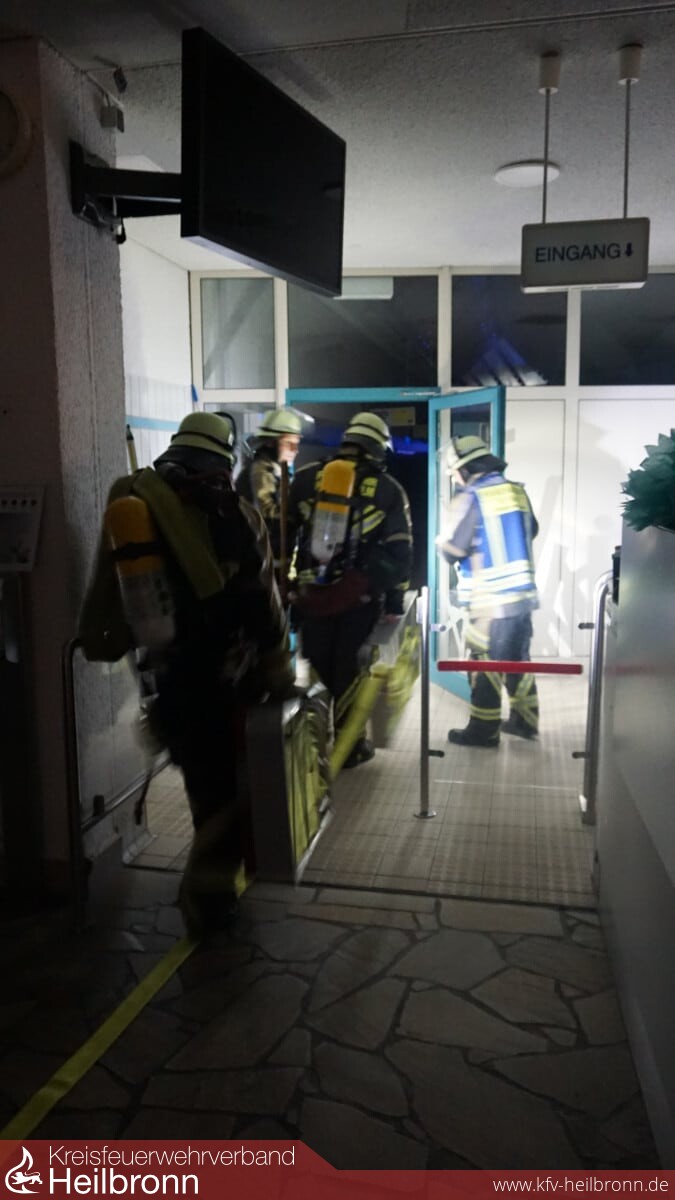 Die zuerst am Einsatzort eingetroffenen Führungskräfte von ELW und LF10 begaben sich zur Erkundung ins Gebäude, um den ausgelösten Bereich über die Feuerwehr-Informationszentrale zu lokalisieren. Kurz darauf erreichte die Einsatzleitung die Meldung, dass eine bestätigte Rauchentwicklung im Bad erkennbar sei und zwei Personen – eine Mutter mit Kind – im Bereich der Umkleide/Wickeltisch vermisst werden. Hierfür wurden zwei Übungspuppen mit etwa 80 Kilogramm Gewicht eingesetzt und entsprechend platziert. Der Angriffstrupp des LF10 begann umgehend mit der Menschenrettung im Schwimmbereich, während weitere Trupps die Wasserversorgung aufbauten.