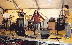 Während die Bands in einem nach vorne offenen Zelt rockten, mussten die Fans draußen bleiben. Wer das wichtigste Utensil des Abends, einen Regenschirm, nicht selber dabei hatte, kuschelte sich mit den anderen unter die flink von den Feuerwehrmännern aufgestellten Zeltdächer und Schirme. Franziska (14) und Marion (13) waren extra wegen Methusalem Komplott gekommen. „Wir kennen die Band und haben sogar eine CD von denen zu Hause“, erzählen sie. Ihrem ersten Impuls, bei dem Regen doch lieber daheim zu bleiben, gaben sie denn doch nicht nach.
