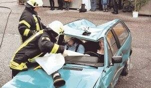 Foto: Routiniert befreiten die Feuerwehrmänner ein verunglücktes Paar aus dem demolierten Auto. Solche Einsätze gehören zur Arbeit der Brandschützer. (Foto: Uwe Mundt)