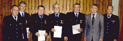 Bild: Dem Dank an Wilhelm Bödinger (links), Kurt Wimmer, Friedrich Reichert, Rainer König und Wilhelm Berg schlossen sich Oberbürgermeister Blättgen und Kreisfeuerwehrverbandsvorsitzender Reinhold Korb an. (Foto: Karoline Beck, HSt)