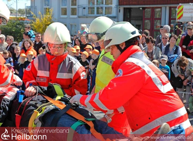 Bild: Die Kameraden der Feuerwehr und des DRK Brackenheim zeigen, wie sie im Notfall vorgehen würden. (Foto: Gerhard Dubinyi)
