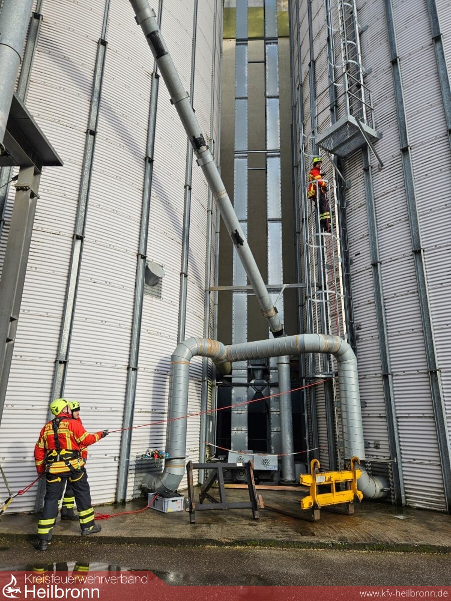 Begonnen hatte die Ausbildung am ersten Tag vormittags mit theoretischen Grundlagen wie z.B. den Unterschieden zwischen Halten/Rückhalten, Absturzsicherung, einfacher Rettung aus Höhen und Tiefen (ERHT) und spezieller Rettung aus Höhen und Tiefen (SRHT). Ebenso wurden Einsatzgrundsätze, Empfehlungen und Vorgaben der Landesfeuerwehrschule sowie der DGUV bei Einsätzen in Höhen und Tiefen betrachtet. Im weiteren Verlauf wurden Möglichkeiten der Gefährdungsbeurteilung, Rettungs- und Backup-Konzepte sowie Erstmaßnahmen bei Hängetrauma und orthostatischem Schock besprochen. Der Rest des Tages stand im Zeichen von Gerätekunde, Hängeproben, Aufbau von Sicherungsständen, Knotenübungen, Vorstellung von Sicherungsautomaten und bereits einem ersten einfachen vertikalen Aufstieg mit Zwischensicherungen an einer Steiganlage der gegenüber der Feuerwache befindlichen Siloanlage der Agroa Raiffeisen/BAG Franken.