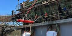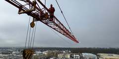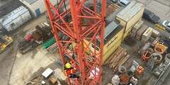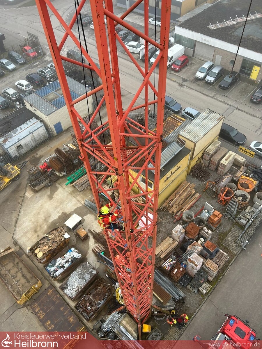 Der 4. Tag stand dann ganz im Zeichen von horizontalem und vertikalem Vorstieg an den Grenzbereichen der ERHT. Hierzu hatte uns die Firma Elischer Bau GmbH Ihren 30m-Kran zur Verfügung gestellt. Geübt wurden der vertikale Aufstieg an den Außenseiten des Turmdrehkrans, der horizontale Vorstieg auf den Kranausleger sowie die Rettung und Rückführung von hilflosen und verletzen Personen aus exponierten Lagen am Kran bzw. Gittermast. Um den vertikalen Vorstieg DGUV-konform abzusichern, kamen hierbei auf einem zusätzlichen Statikseil mitlaufende Sicherungsgeräte Petzl ASAP zum Einsatz.
