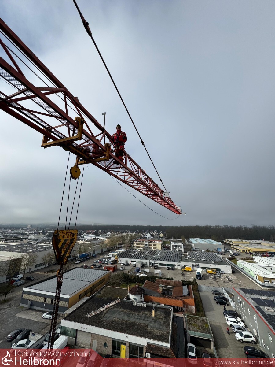 Der 4. Tag stand dann ganz im Zeichen von horizontalem und vertikalem Vorstieg an den Grenzbereichen der ERHT. Hierzu hatte uns die Firma Elischer Bau GmbH Ihren 30m-Kran zur Verfügung gestellt. Geübt wurden der vertikale Aufstieg an den Außenseiten des Turmdrehkrans, der horizontale Vorstieg auf den Kranausleger sowie die Rettung und Rückführung von hilflosen und verletzen Personen aus exponierten Lagen am Kran bzw. Gittermast. Um den vertikalen Vorstieg DGUV-konform abzusichern, kamen hierbei auf einem zusätzlichen Statikseil mitlaufende Sicherungsgeräte Petzl ASAP zum Einsatz.