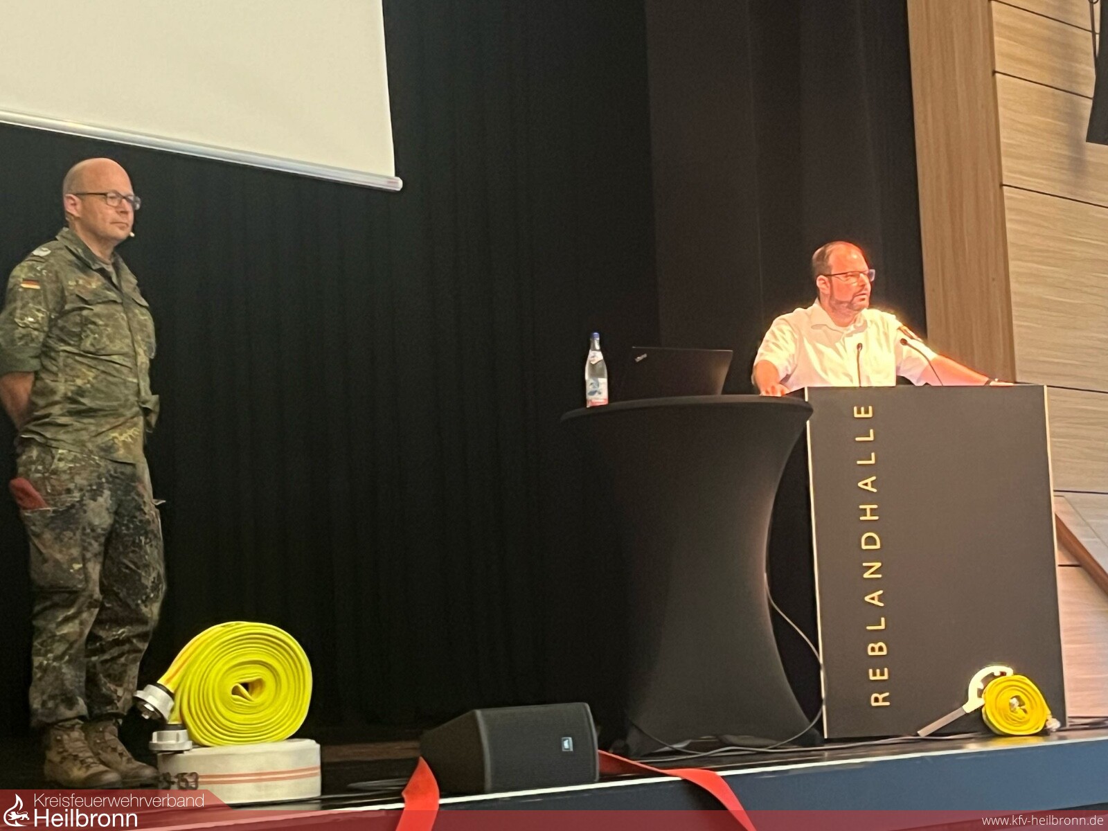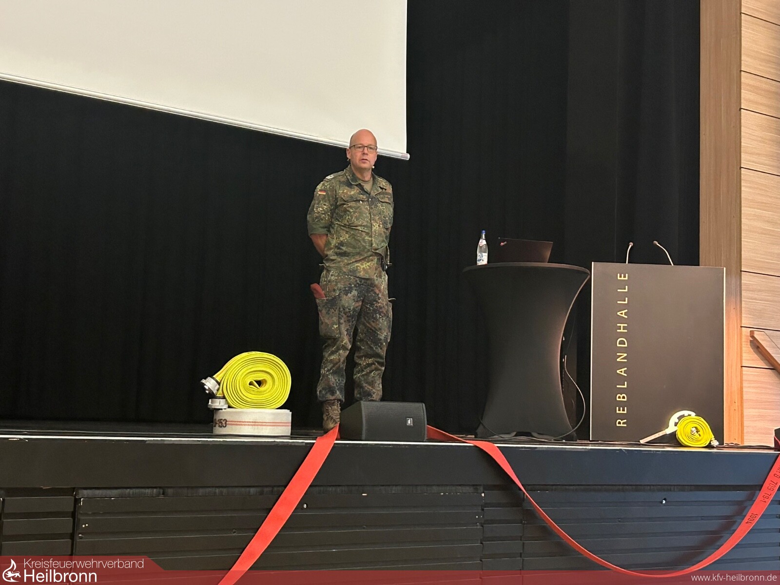 Der Leiter des Kreisverbindungskommandos Heilbronn Land, berichtete über den aktuellen Kenntnisstand zum OPLAN Deutschland und zeigte, was u.U. in den kommenden Jahren an weiterführenden Aufgaben auf die Kommunen aber auch auf die Feuerwehren und den Bevölkerungsschutz zukommen können. Im Anschluss erläuterte der Referent gemeinsam mit Marc Hoffmann (Leiter des Amts Sicherheit und Ordnung im Landratsamt Heilbronn) den aktuellen Stand des Bevölkerungsschutzes im Landkreis Heilbronn und standen für Fragen zur Verfügung.