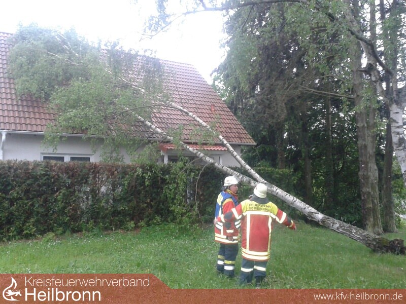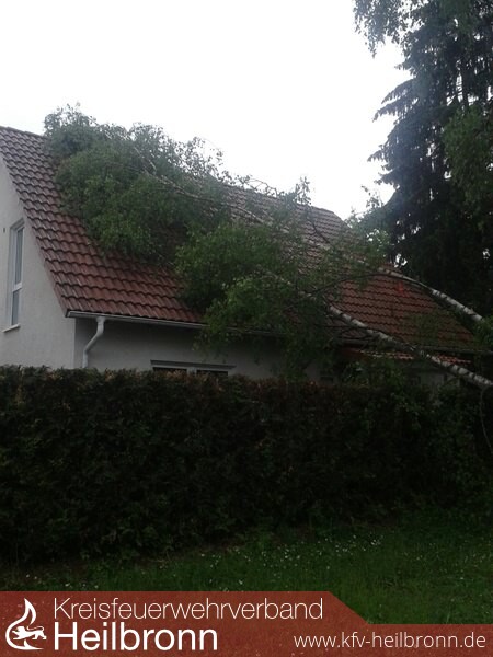 Aufgrund Starkregen und Sturm stürzte ein zirka 12 Meter hoher Birkenbaum auf ein Einfamilienhaus in der Untergriesheimer Cäcilienstraße. Durch die starken Niederschläge gestaltete sich die Anfahrt für die Kräfte der Feuerwehr schwierig und gefährlich. Der Baum wurde unter Einsatz mehrerer Motorsägen zersägt. Das Hausdach blieb Gott sei Dank weitgehend unbeschädigt.