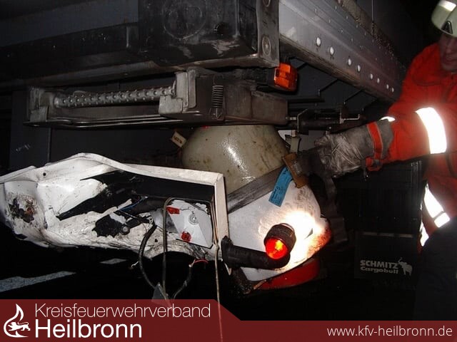 Vermutlich durch Unachtsamkeit fuhr ein PKW Fahrer, auf der BAB 81 kurz hinter der Anschlussstelle Möckmühl, unter einen Sattelauflieger.Der Aufprall war so stark, dass der komplette Unterfahrschutz im Heckbereich beschädigt und zum Teil abgerissen wurde.
