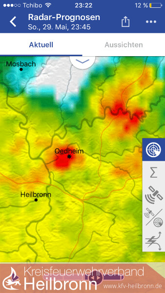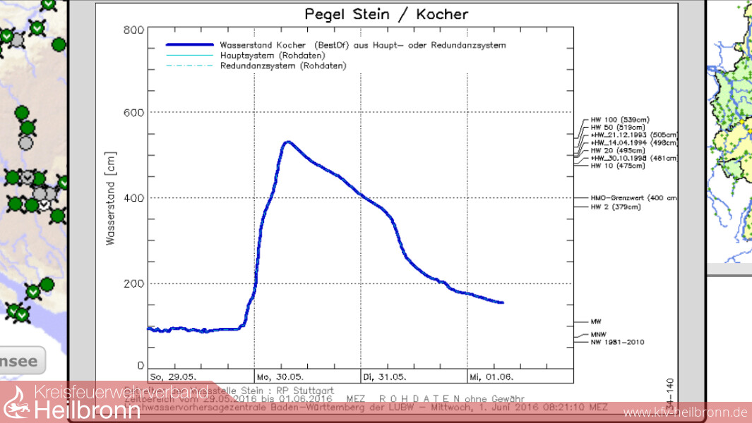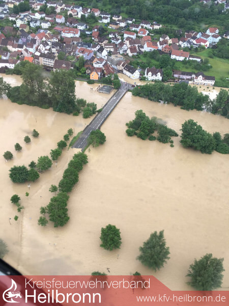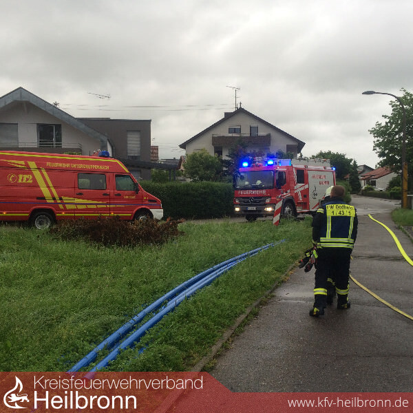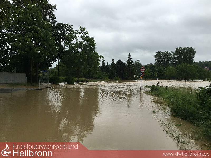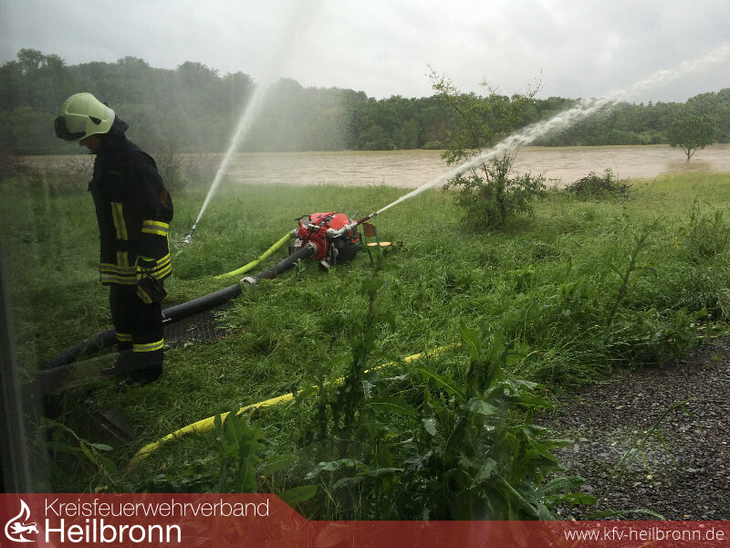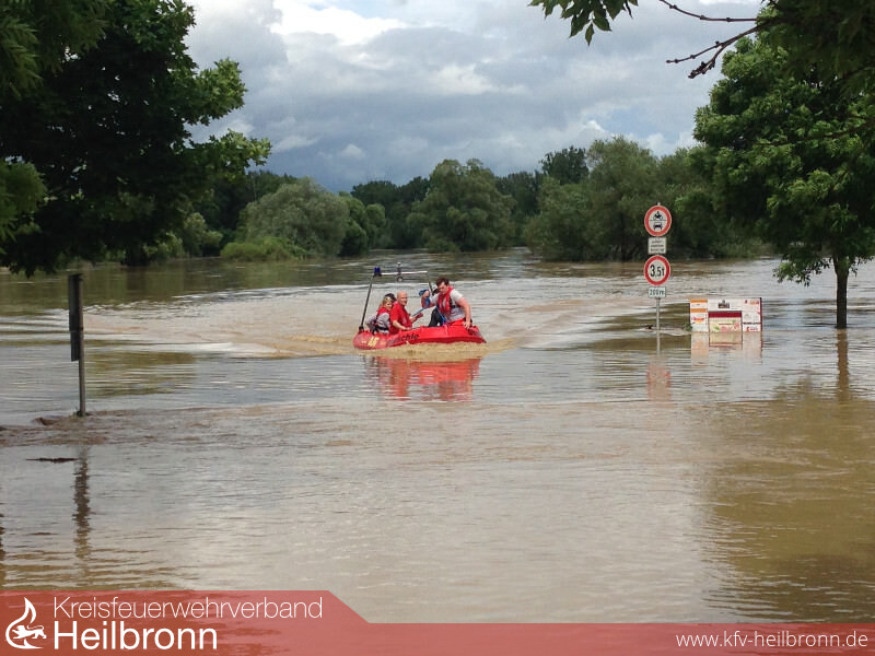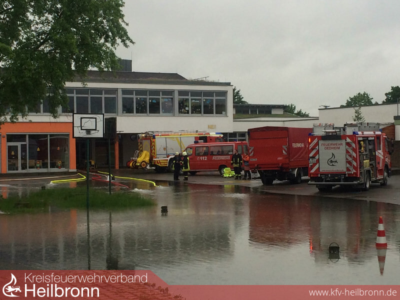 Im Rahmen des Unwettermoduls wurde die Alarmierung von Meldeempfänger auf Fax umgestellt. Die technische Einsatzleitung wurde im Gerätehaus der Feuerwehr Oedheim eingerichtet. Von hier aus wurden die über Fax gemeldeten Einsätze den einzelnen Gruppen und Zügen zugeordnet. Neben unzähligen vollgelaufenen Kellern musste die Feuerwehr zu mehreren Erdrutschen ausrücken. Besonders betroffen war hier von die Kreisstraße 2139 zwischen Oedheim und Bad Friedrichshall, welche auf unbestimmte Zeit gesperrt bleiben muss. Auch größere Einsatzstellen wie z.B. das Oedheimer Hallenbad und die Kochertalschule mussten abgearbeitet werden. Gegen 5 Uhr am 30. Mai stieg der Kocherpegel über den Hochwassermeldewert. Da das Passieren der Kocherbrücke eine Stunde später nicht mehr möglich war, wurden Fahrzeuge und Personal rechtzeitig zur Sicherung des Grundschutzes auf beide Seiten verteilt. Mit steigendem Kocherpegel wurde der Damm zum angrenzenden Campingplatz so stark beansprucht, dass gegen 7 Uhr ein kritischer Wert erreicht wurde. Ca. 100 Bewohner und Urlauber mussten vorsichtshalber evakuiert werden. Diese wurden durch das Deutsche Rote Kreuz betreut und versorgt. Ebenfalls musste ein im Altdorf liegender Lebensmittelmarkt gegen Eindringen der Wassermassen gesichert werden. Zusammen mit der DRLG musste die Feuerwehr Oedheim im weiteren Verlauf 3 Personen aus einem vom Hochwasser eingeschlossenen Haus retten. In der Nacht vom 31. Mai wurde die Feuerwehr Oedheim gegen 0:44 Uhr zu einem vermeintlichen Brand eines Lebensmittelmarktes alarmiert. Vor Ort staunten die Einsatzkräfte nicht schlecht, als aus dem zuvor überfluteten Erdreich neben dem Lebensmittelmarkt Dampf aufstieg. Als Ursache konnte ein alter aber noch unter Spannung stehender Stromkasten ausfindig gemacht werden, welcher ca. 30cm tief im Boden lag. Die Einsatzstelle wurde abgesperrt und der zuständige Energieversorger beauftragt.