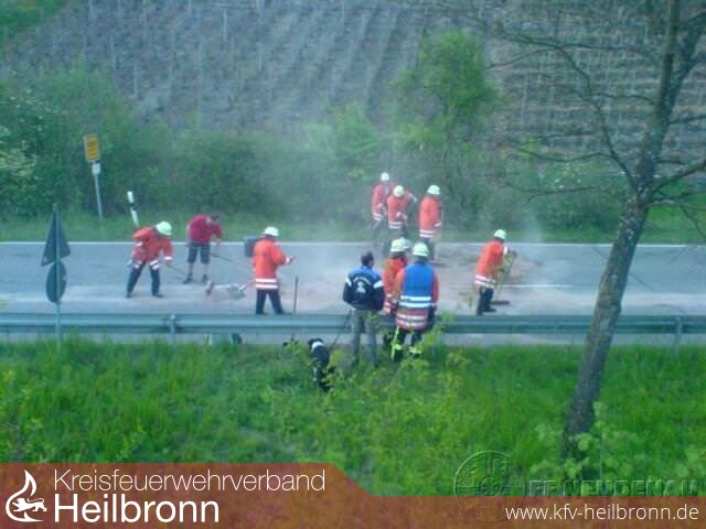 Mittels Schnellangriff vom TLF und einem Feuerlöscher wurde dann der Brandschutz sichergestellt, während die Kameraden aus Siglingen die Fahrbahn mit Ölbindemittel abstreuten.