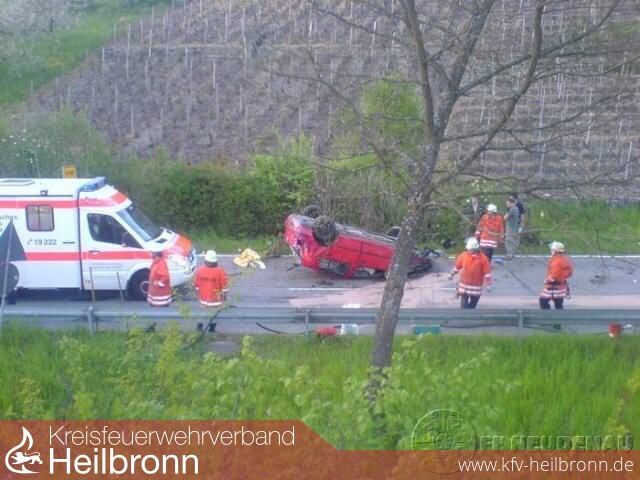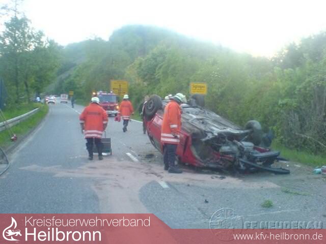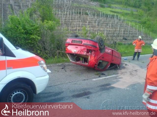 Dort bot sich folgendes Bild: ein PKW lag auf dem Dach, ein Notarztwagen aus Möckmühl war bereits vor Ort, die zwei Insassen konnten sich Gott sei Dank selbst aus dem Fahrzeug befreien. Ein zweiter Rettungswagen war ebenfalls auf der Anfahrt.