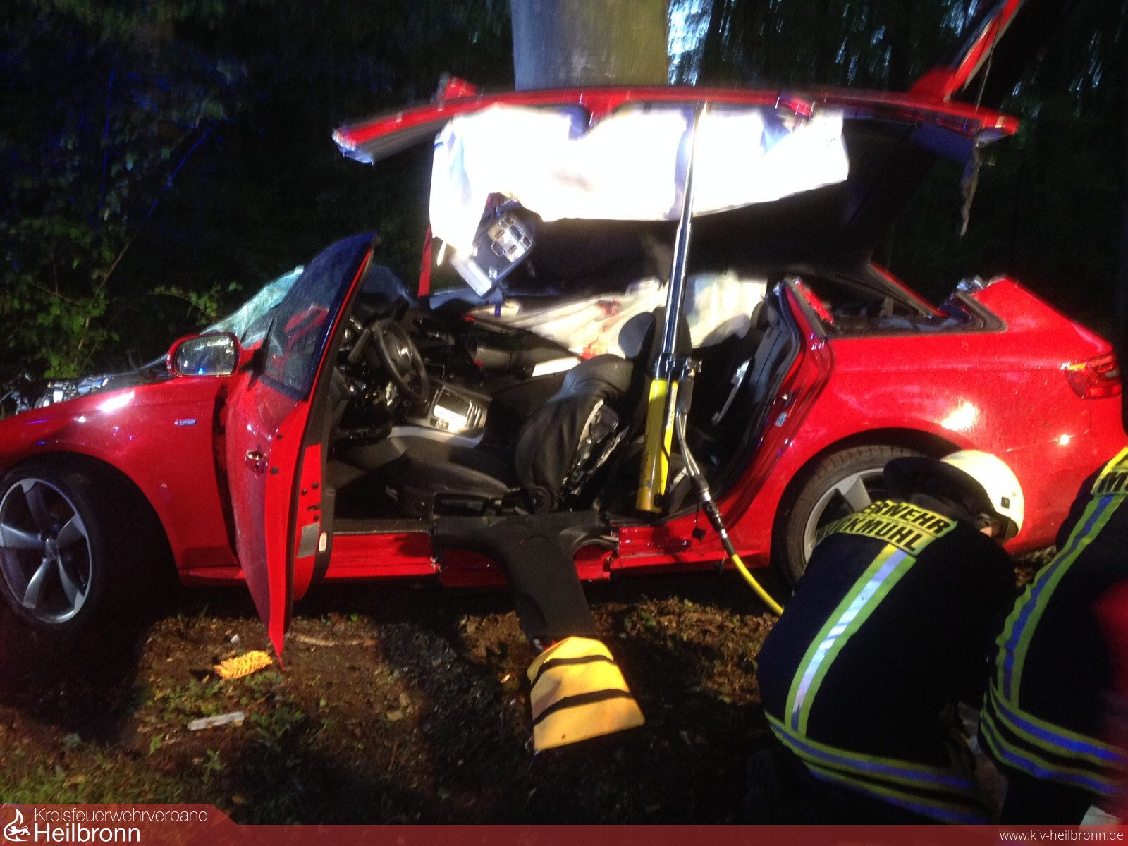 Zur Bergung des Fahrers setzte die Feuerwehr Schere, Spreizer und Rettungszylinder ein. Weiterhin wurde die Einsatzstelle für die Unfallaufnahme ausgeleuchtet.