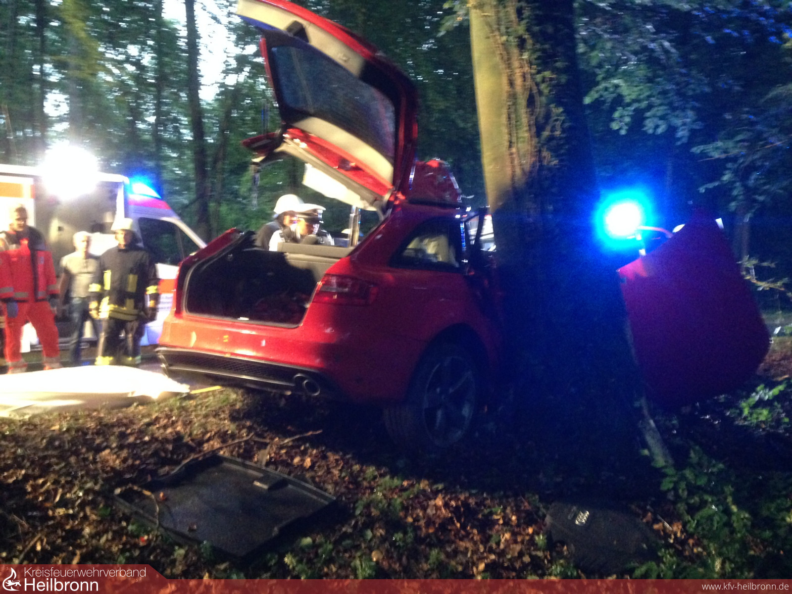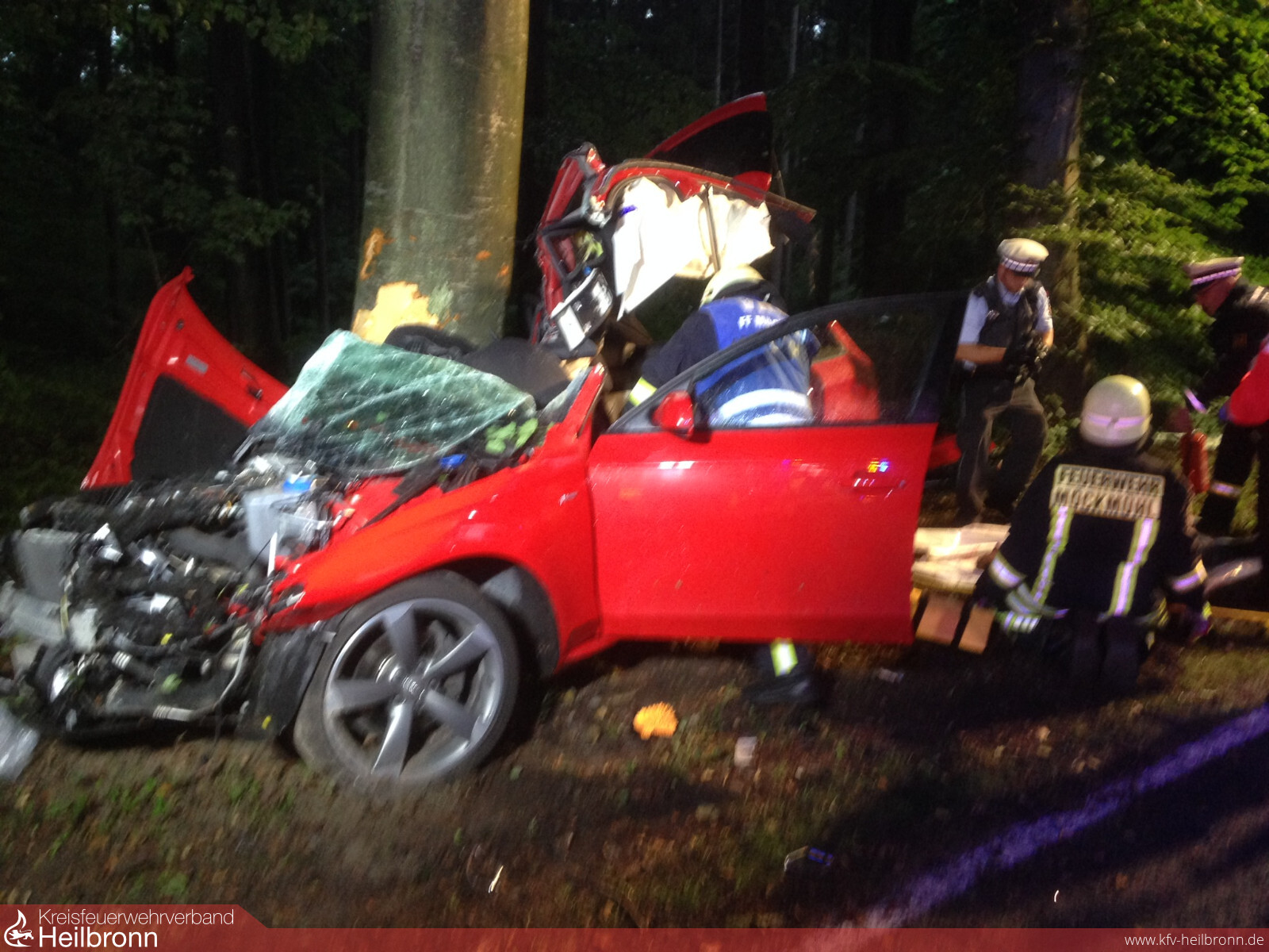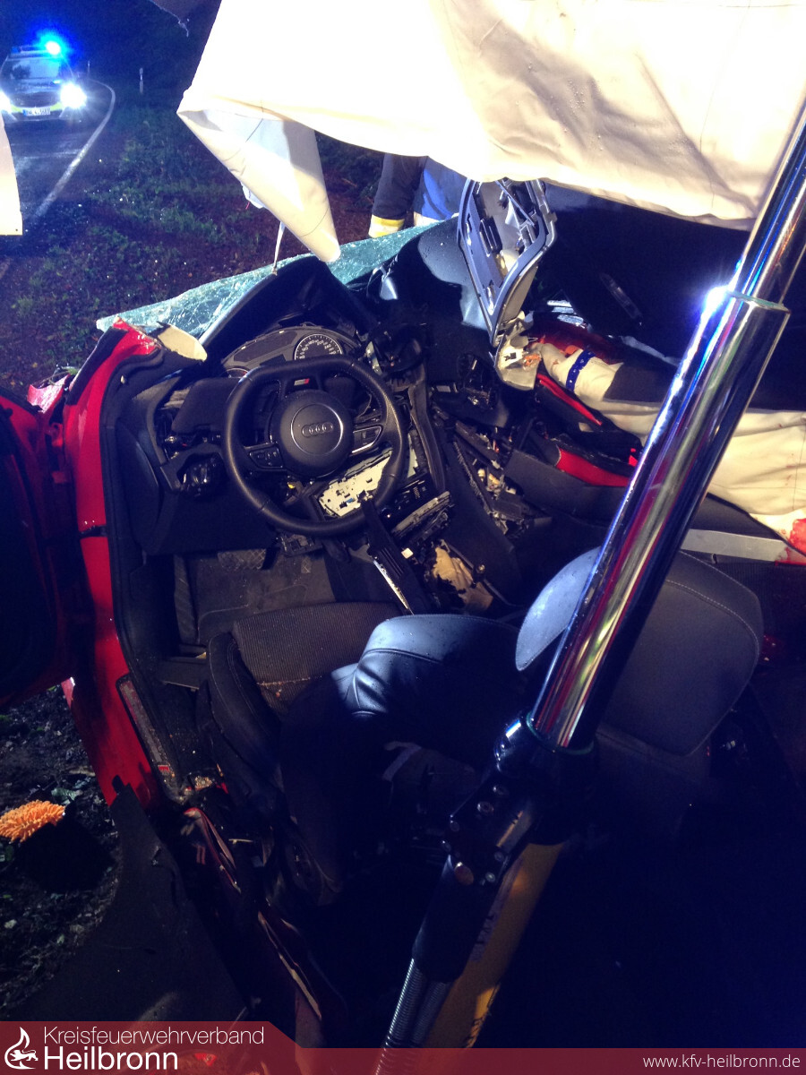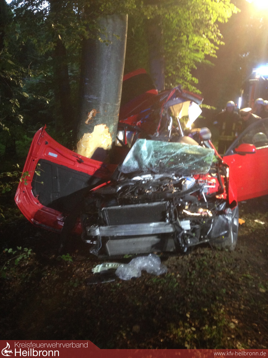 Zu einem Verkehrsunfall mit eingeklemmter Person wurden die beiden Abteilungen Möckmühl und Züttlingen auf die L1095 gerufen. Ein Verkehrsteilnehmer war in Fahrtrichtung Möckmühl, kurz nach der Abzweigung Gochsen, in einer leichten Rechtskurve nach links von der Fahrbahn abgekommen und schleuderte mit der Beifahrerseite seines Fahrzeuges gegen einen Baum. Der Aufprall war so heftig, dass der eintreffende Notarzt nur den sofortigen Tod des jungen Mannes feststellen konnte.