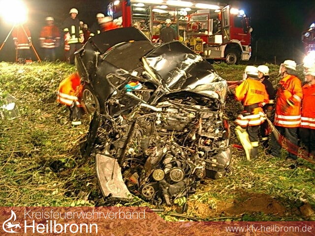 Zu einem schweren Verkehrsunfall wurde die Feuerwehr Neudenau, mit allen Abteilungen, an die L1096, direkt am Ortsausgang von Siglingen gerufen. Bei der Ersterkundung wurde sofort deutlich, dass zur Bergung des Fahrers unbedingt ein Rüstwagen, ausgestattet mit einer Seilwinde, erforderlich ist. Deshalb wurde umgehend die Feuerwehr Möckmühl mit Rüstwagen und Vorausrüstwagen nachalarmiert.Den Einsatzkräften bot sich ein Bild der Zerstörung. Der PKW prallte frontal gegen einen Baum. Dabei wickelte sich nicht nur der Motorbereich um den Baum, sondern der PKW knickte nochmals in der Mitte ab, wobei sich das Dach ebenfalls um den Baum drückte, diesen komplett entwurzelte und umlegte.Für die Einsatzkräfte war es zunächst nicht möglich, an den vermutlich sofort verstorbenen jungen Fahrer heranzukommen. Ob sich weitere Personen im Fahrzeug befanden, war in dieser Lage ebenfalls nicht zu erkunden. Für ein Weiterarbeiten musste zunächst der Baum zersägt werden, erst danach konnte der PKW mit der Winde des Rüstwagens gedreht und der Fahrer mit hydraulischem Rettungsgerät aus dem Wrack befreit werden.Weitere Personen waren glücklicherweise nicht im Fahrzeug.Für die am Einsatz beteiligten Möckmühler Feuerwehrangehörigen bestätigte sich aber nach der Befreiung des Verunfallten die erste Vermutung, dass es sich bei dem Fahrer um einen ehemaligen Möckmühler Feuerwehrkameraden handelte. Der junge Mann war lange Zeit in der JFW Möckmühl tätig und bis zu seinem Umzug nach Neudenau, vor ca. einem Jahr, auch knapp fünf Jahre Mitglied in der aktiven Mannschaft.