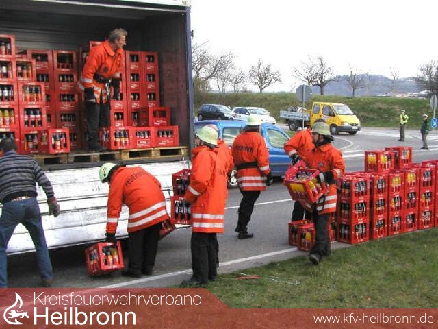 Innerhalb kurzer Zeit hatten die gegen 16:45 Uhr zur Unterstützung des Straßenbauamtes angeforderten 15 Mann der Feuerwehr Heilbronn die Flaschen und Kisten eingesammelt und auf dem Anhänger wieder verlastet.