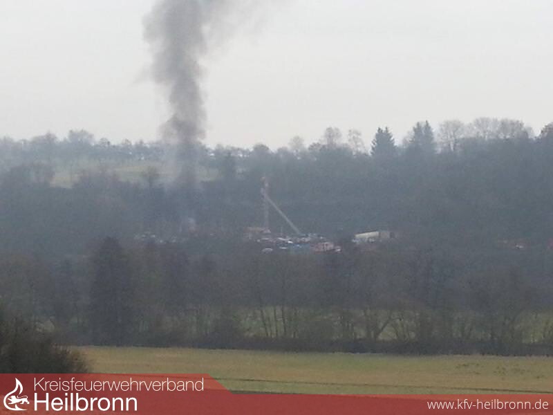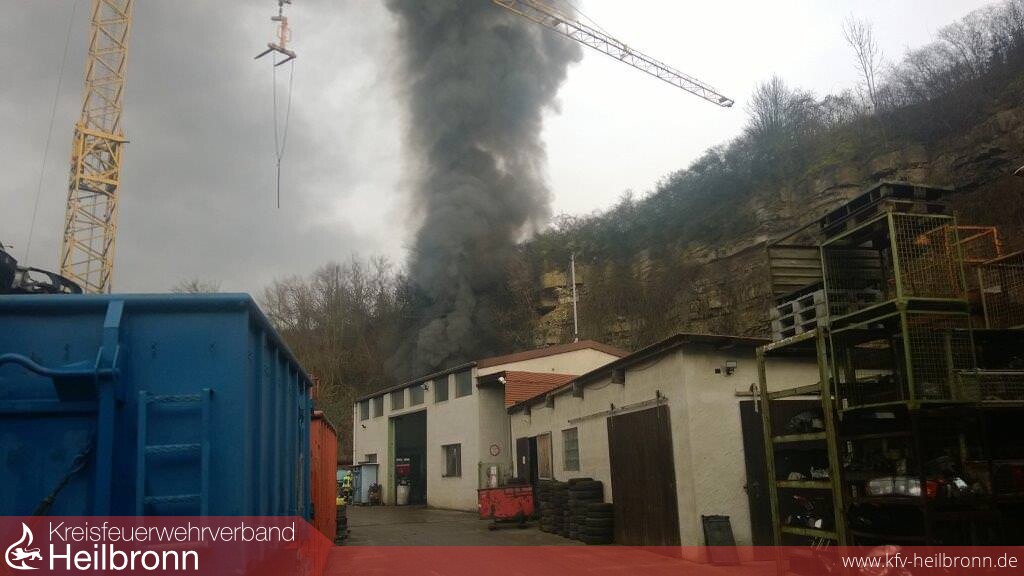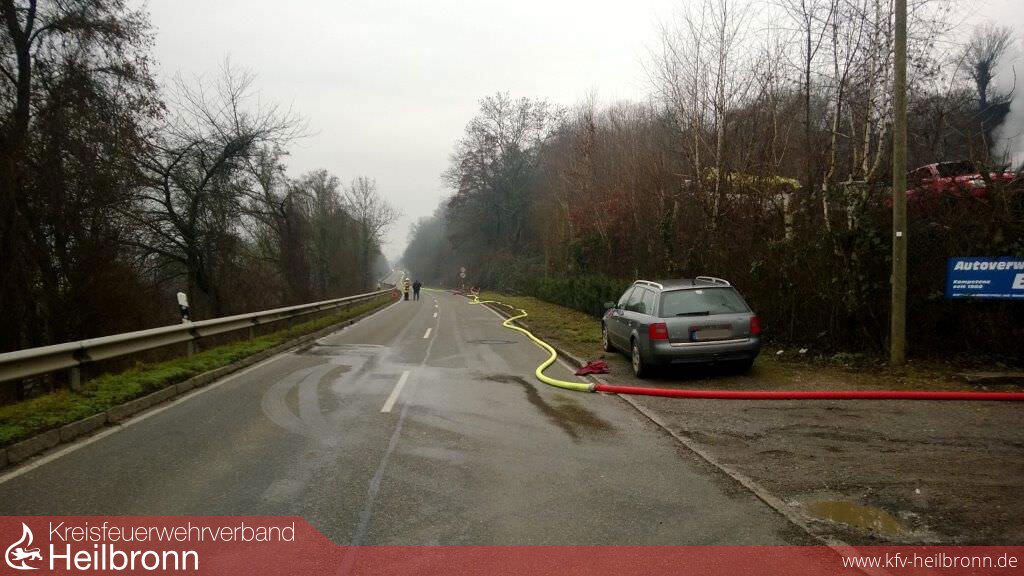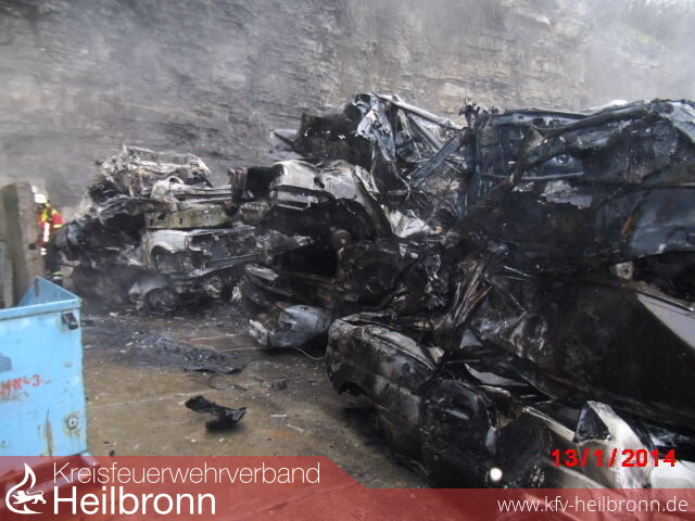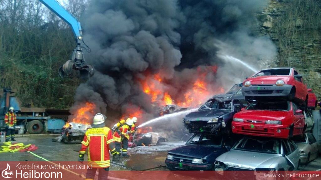 Bereits auf der Anfahrt war eine Rauchsäule sichtbar, was den Einsatzleiter veranlasste eine umfangreiche Nachalarmierung durchführen zu lassen. Beim Eintreffen der ersten Einsatzkräfte standen 50 Fahrzeuge, welche teilweise sieben Reihen hoch gestapelt waren, in Vollbrand. Die angrenzende Werkstatt war gerade mal zirka 4 Meter von den brennenden Fahrzeugen entfernt, was eine massive Riegelstellung erforderlich machte. Aufgrund der schlechten Wasserversorgung in dem außer Orts liegenden Industriebetrieb mussten zwei zirka ein Kilometer lange Wasserleitungen aus Untergriesheim aufgebaut werden. Um rasch Löschmaßnahmen durchführen zu können, kamen die beiden Abrollbehälter Wasser der Feuerwehren Neckarsulm und Heilbronn zum Einsatz. Vom Engerieversorger musste eine Überspannungsleitung, welche über das Brandobjekt hing, stromlos gemacht werden. Ein Ölabscheider wurde durch die Feuerwehr verschlossen, um kontaminiertes Löschwasser zurück zu halten, welches später durch eine Fachfirma entsorgt wurde. Aufgrund der starken Rauchentwicklung wurde der Gerätewagen Meßtechnik der Feuerwehr Neckarsulm mitalarmiert. Bereits auf der Anfahrt sowie auch um den Bereich der Einsatzstelle wurden Messungen durchgeführt, welche keine gesundheitsschädlichen Werte aufgewiesen haben.