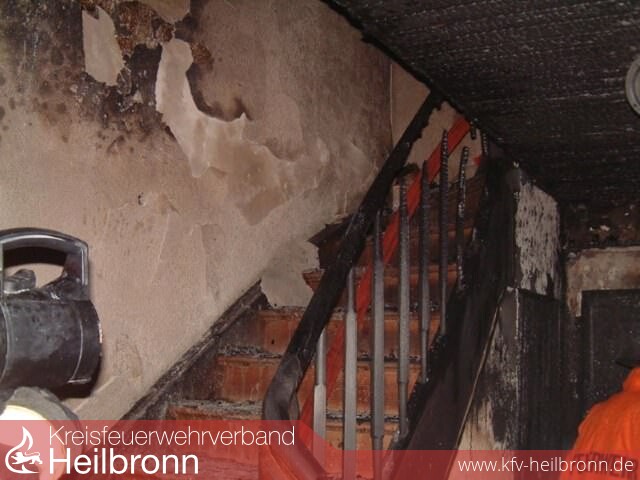 Die breits um 2.09 Uhr traf die Abteilungswehr Massenbach an der Einsatzstelle ein. Die Fahrzeuge der Abteilung Schwaigern-Stadt folgten nur wenig später. Zu diesem Zeitpunkt brannte die Wohnung auf zwei Etagen in voller Ausdehnung. Zwei der drei Bewohner konnten sich noch rechtzeitig ins Freie retten, mussten aber bei mit Rauchvergiftungen ins Krankenhaus gebracht werden. Der dritte Bewohner, ein 75jähriger Mann wurde vermißt.Sofort wurde unter Atemschutz mit der Suche nach dem Vermißten begonnen und gleichzeitig ein Löschangriff eingeleitet.