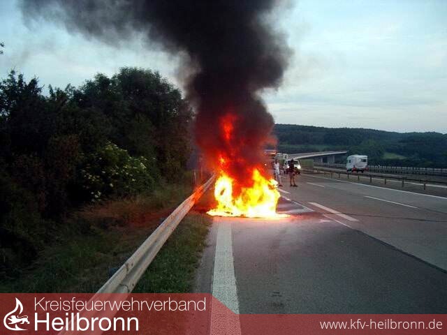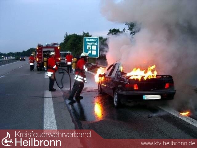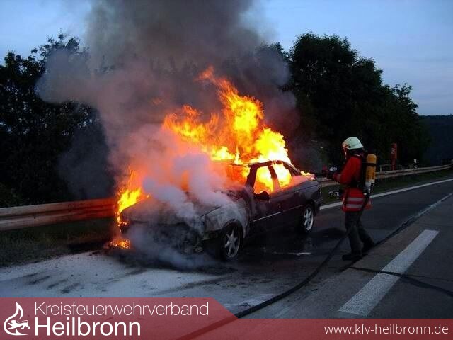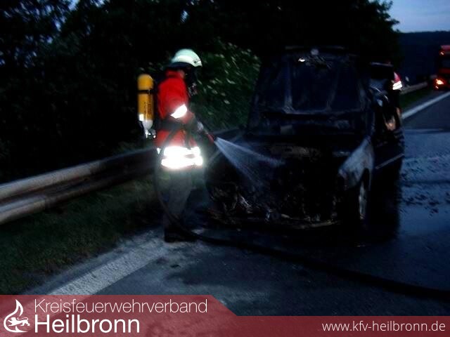 Bereits auf der Anfahrt über die Jagsttalbrücke der A81 war die starke Rauchentwicklung zu sehen. Beim Eintreffen an der Einsatzstelle stand der PKW bereits in Vollbrand. Unter Atemschutz wurde dann das Fahrzeug abgelöscht.