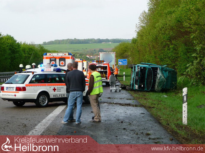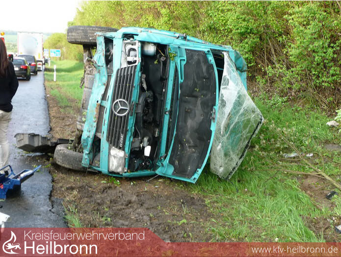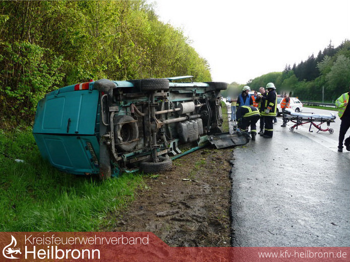 Kurz vor der Jagsttalbrücke kam ein mit vier Personen besetzter MB Sprinter aus nicht geklärter Ursache von der Fahrbahn ab und überschlug sich mehrfach.