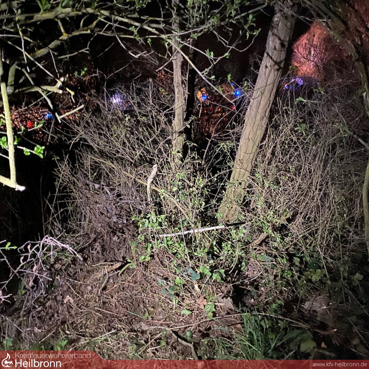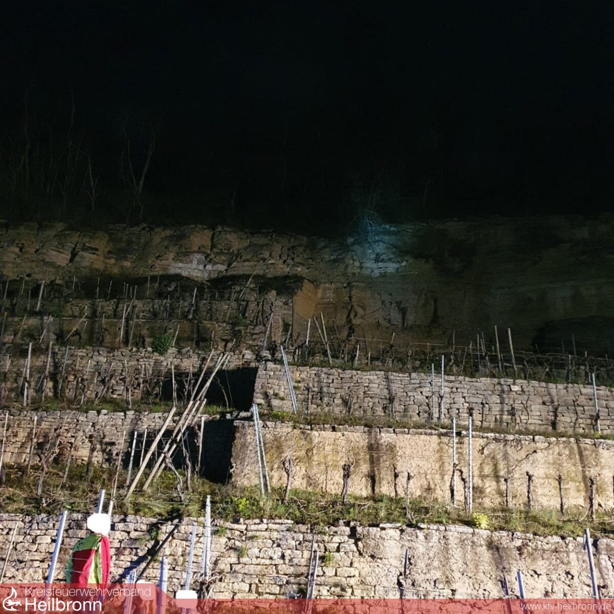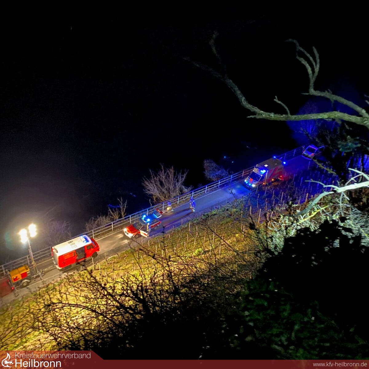 Die verletzte Person wurde daraufhin von einer Fahrzeugbesatzung der Feuerwehr Lauffen in einem Weinberg in der Nähe des Neckartalradwegs aufgefunden. Von einem Rettungssänitäter der Feuerwehr wurde die verletzte Person bis zum Eintreffen des Notarzt und dem Rettungsdienst erstversorgt. Ebenfalls wurde durch den Lichtmast-Anhänger der Feuerwehr Lauffen die Einsatzstelle großflächig ausgeleuchtet.