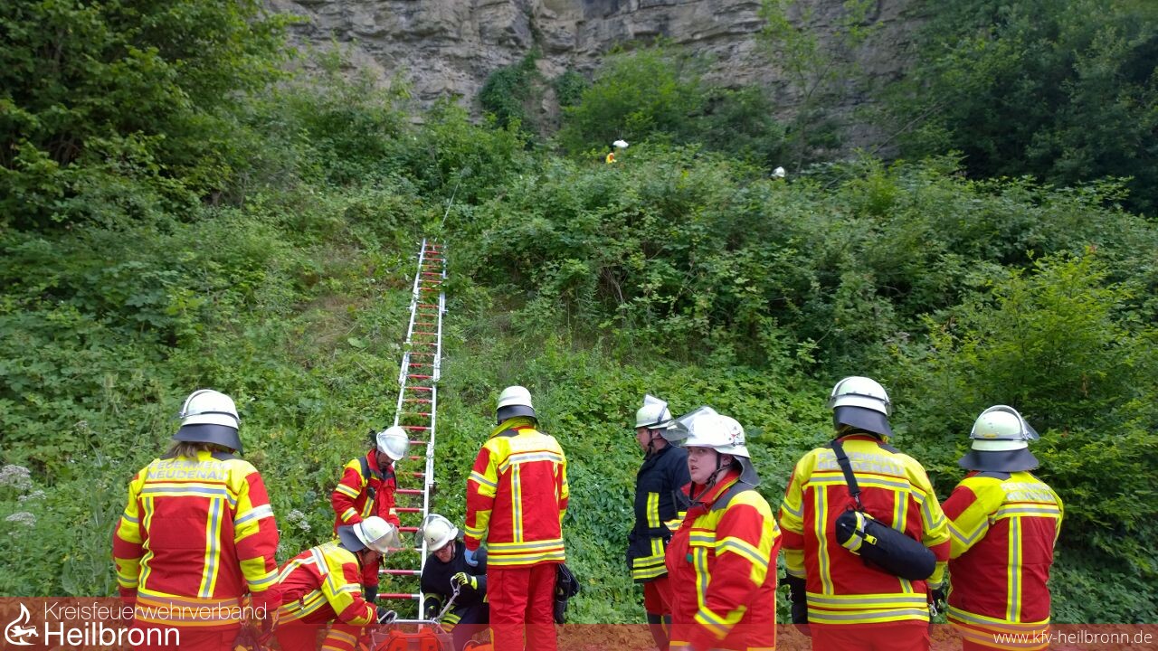 Über Spineboard und Schleifkorbtrage der Feuerwehr wurde der Jugendliche patientengerecht (vor allem achsengerecht) gerettet und dem Rettungsdienst übergeben. Hierbei kamen wieder mehrere Leitern als „Rutsche“ für die Schleifkorbtrage zum Einsatz.