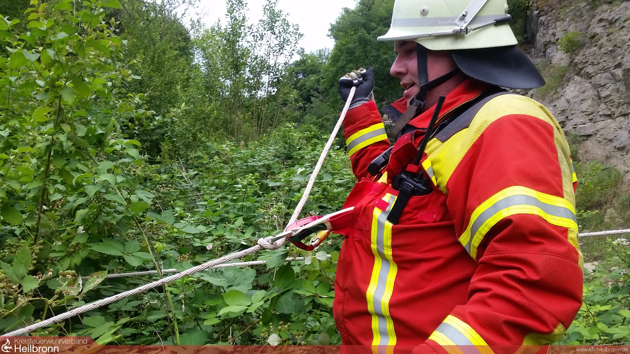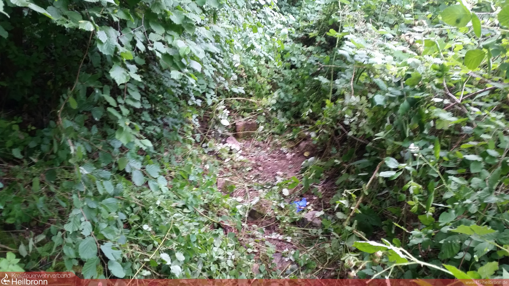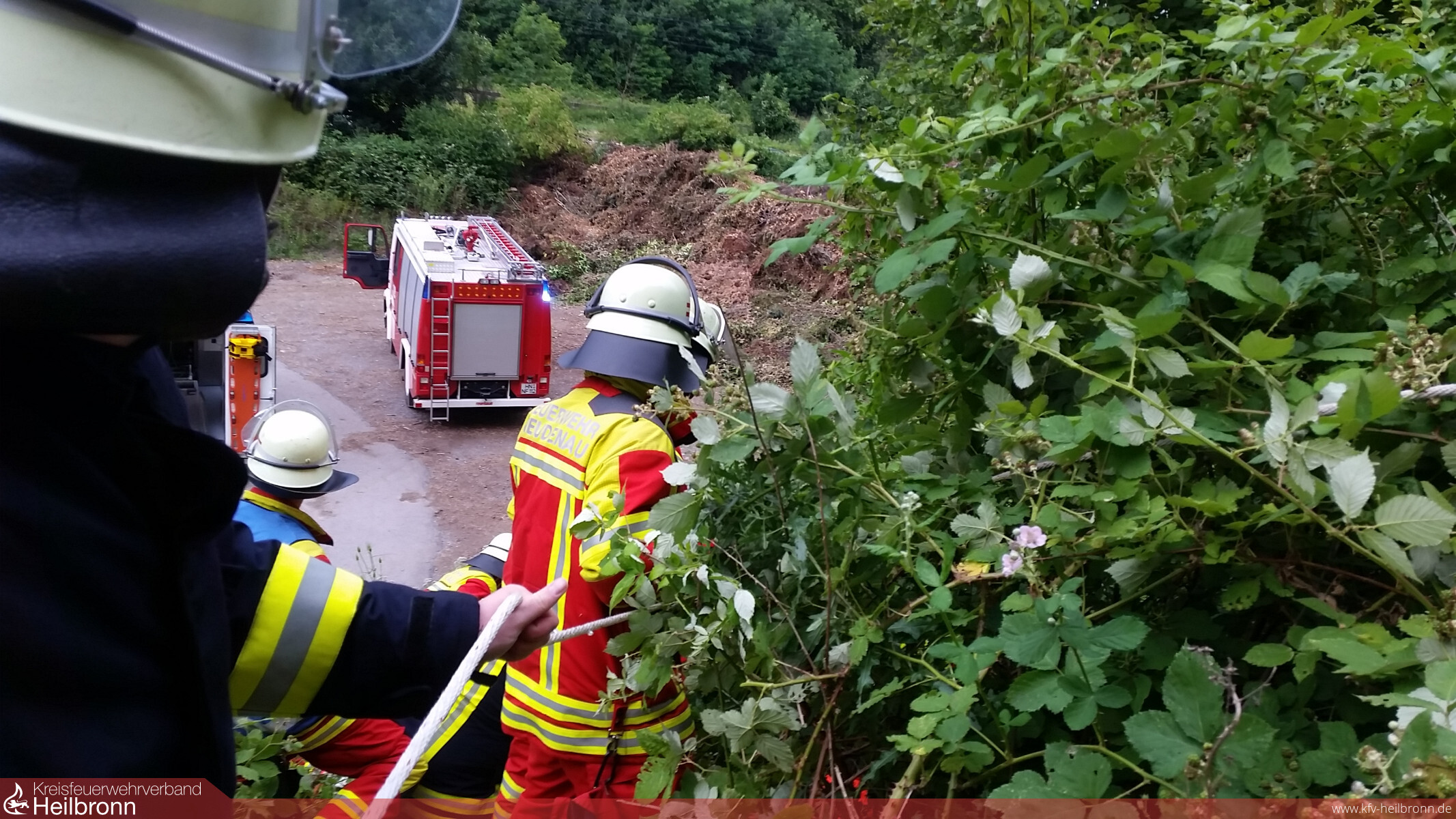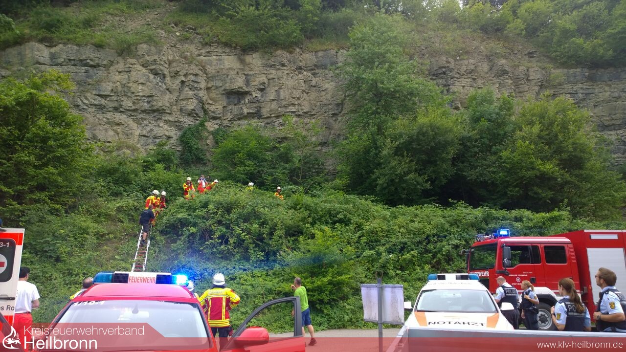 Die Einsatzkräfte wurden beim Eintreffen bereits von Polizei und vielen „Suchenden“ erwartet. Zur Erkundung und Erstversorgung ging die Kommandowagen-Besatzung vor. Schon kurz darauf konnte der Mannschaft des Tanklöschfahrzeuges der Auftrag gegeben werden, sich einen Weg zum Verunfallten zu bahnen. Hierzu waren mehrere Leitern und die Sicherung über Feuerwehrleinen nötig.