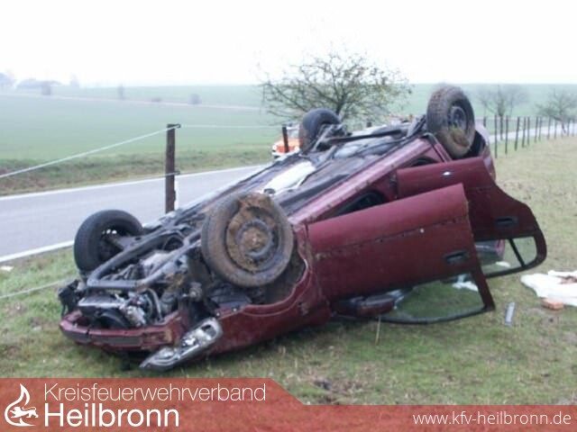 Auf der Kreisstraße K 2140, zwischen Heuchlingen und Willenbach, kam ein Fahrzeug von der Fahrbahn ab, überschlug sich mehrmals und blieb auf dem Dach in einer Reitkoppel liegen.