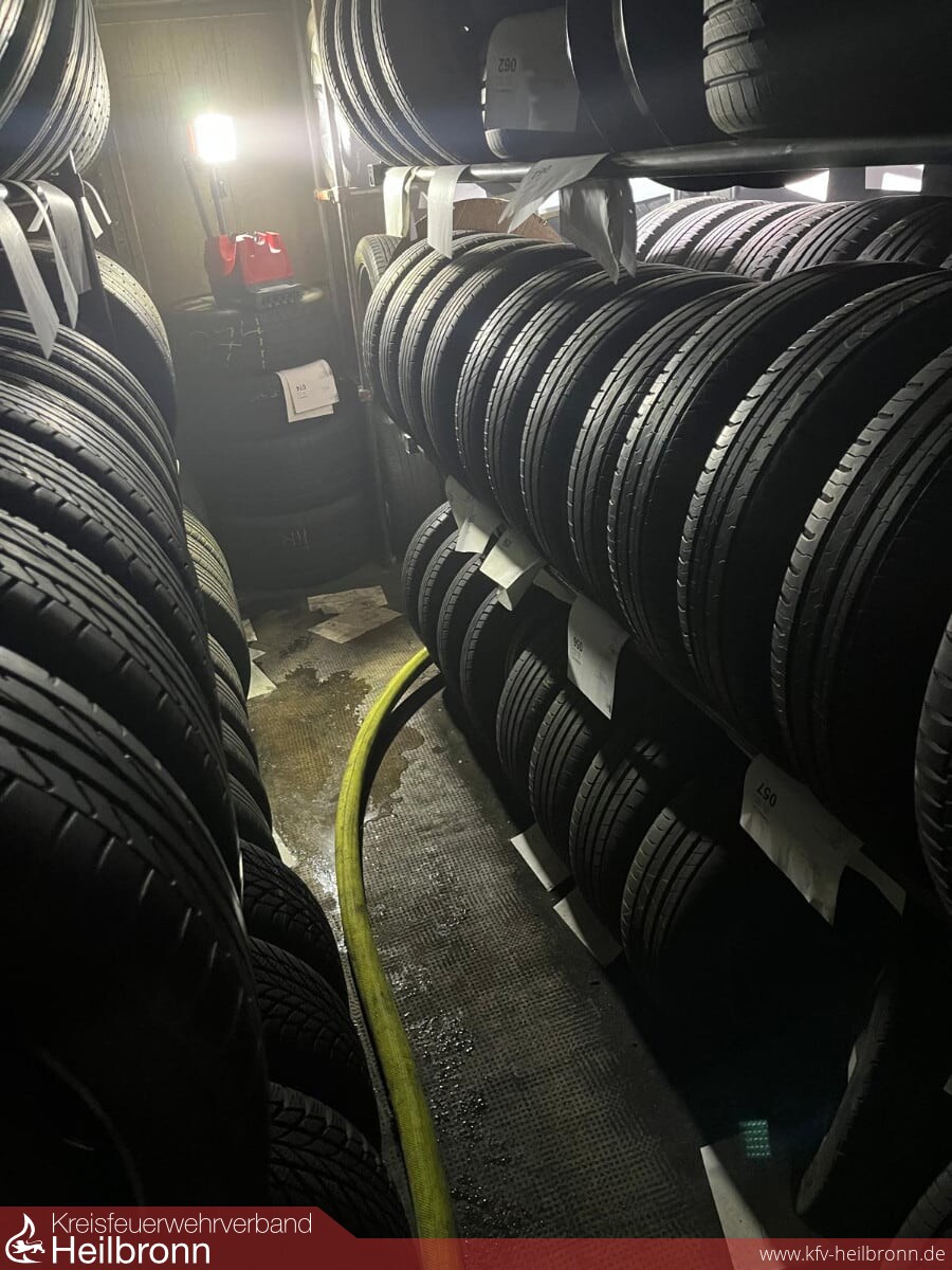 Die Trupps im Innenangriff hatten durch die dichte Verrauchung nahezu Nullsicht in allen Ober- und Untergeschossen des Gebäudes. Aufgrund der Vielzahl der gelagerten Reifen, die in allen Bereichen des Gebäudes gestapelt waren, war ein Nachführen der Angriffsleitungen durch die Trupps im Innenangriff bei einem stark verschlungenen Angriffsweg von ca. 50 Metern nahezu aussichtslos. Daher mussten weitere Trupps unter Atemschutz an verschiedenen Stellen im Keller das Schlauchmanagement übernehmen, um überhaupt vorankommen zu können.