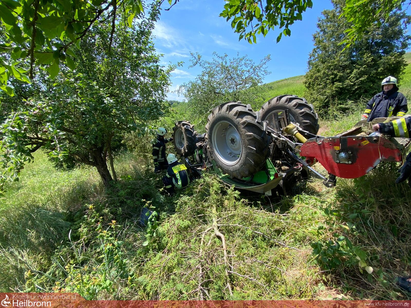 Um ein weiteres Auslaufen zu verhindern und eine Bergung aus der Hanglage zu ermöglichen, musste der Traktor mit einem Mehrzweckzug, einer Umlenkrolle sowie mit der Hilfe eines weiteren Traktors aufgerichtet werden. Die Feuerwehr Oedheim war mit 4 Fahrzeugen und 12 Mann im Einsatz.