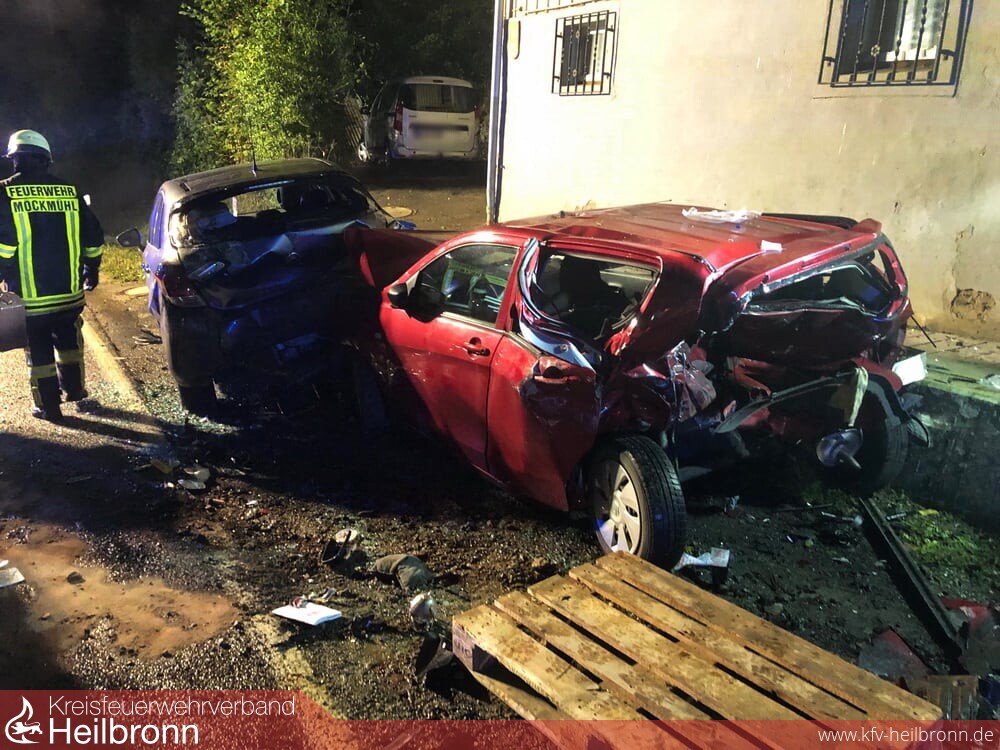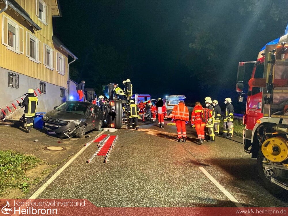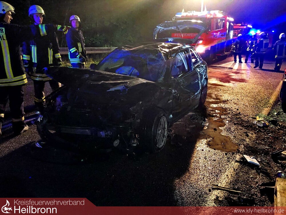 Zu einem Verkehrsunfall mit einer eingeklemmten Person wurde die Abteilung Möckmühl auf die L1095 zwischen dem Ortsteil Züttlingen und dem Weiler Ernstein gerufen. Ein Audi-Fahrer kam auf nasser Fahrbahn in einer Rechtskurve ins Schleudern und prallte auf zwei abgestellte PKW. Der Audi überschlug sich und blieb auf der Seite liegen. Während sich Fahrer und Beifahrerin selbst aus dem Fahrzeug retten konnten, musste die Beifahrerin im Fond von den Einsatzkräften aus dem Fahrzeug gerettet werden.