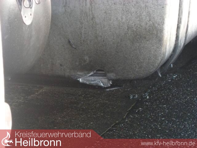 Ein in Richtung Mannheim fahrender slowakischer Lkw riss sich am Mittwoch vormittag den Treibstofftank auf. Die Feuerwehr Neckarsulm wurde daraufhin um 11:36 Uhr mit dem Stichwort "Auslaufender Krafstoff/Öl" alarmiert.