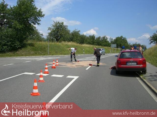 Nach einem Verkersunfall auf der Kreuzung K2116 und K 2117 zwischen einem PKW und einem Kleinkraftrad war Kraftstoff ausgetreten. Der Kraftstoff wurde mit Bindemittel aufgenommen und entsorgt. Zur Warnung der Verkehrsteilnehmer wurden Warnschilder „Ölspur“ aufgestellt.