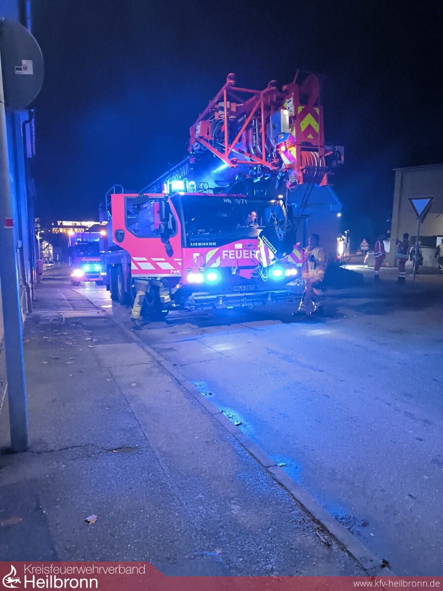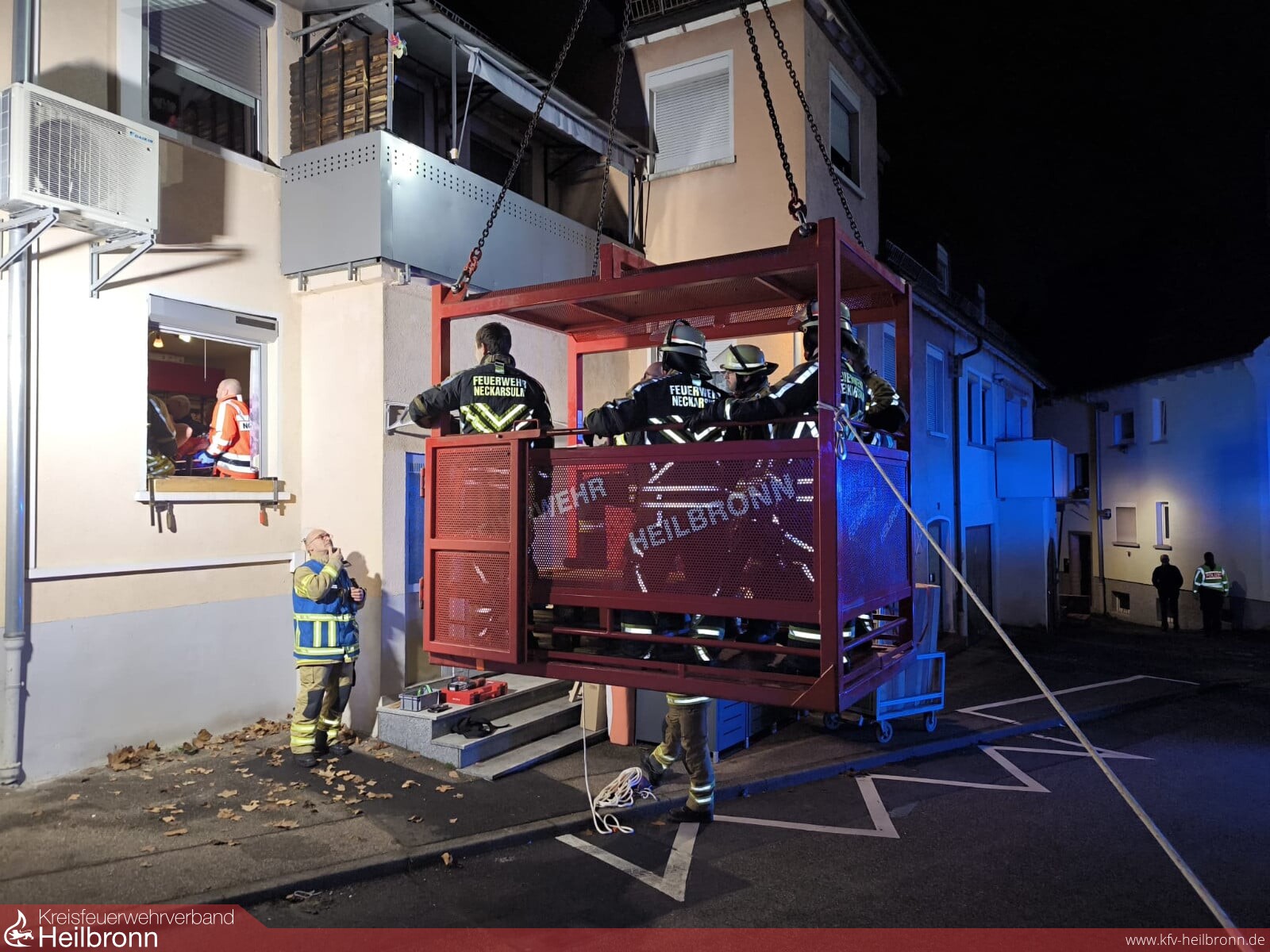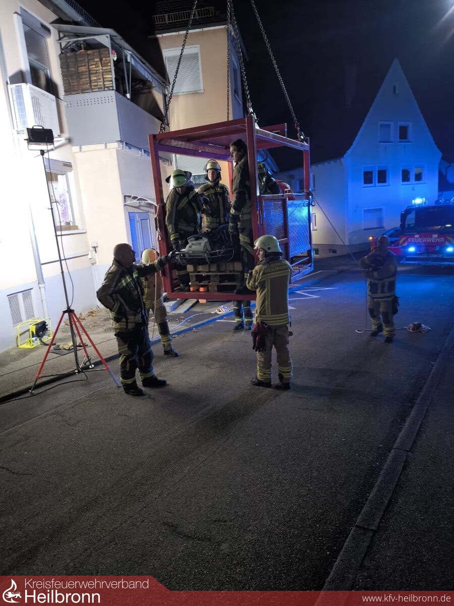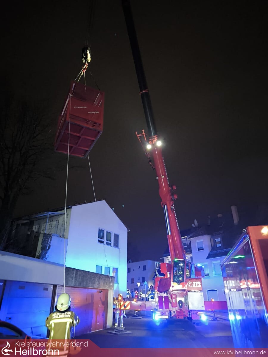 Nach Abschluss der gesamten Vorbereitungen gelang es mit vereinten Kräften und unter Einsatz des Rettungskorbes am Feuerwehrkran die Person schonend und sicher aus dem Gebäude und anschließend in das bereitstehende Spezialrettungsmittel zu verbringen. Die Kräfte der Feuerwehr Neckarsulm begleiteten nachfolgend den Transport in eine nahegelegene Klinik und unterstützten dort bei der erneuten Umlagerung des Patienten.
