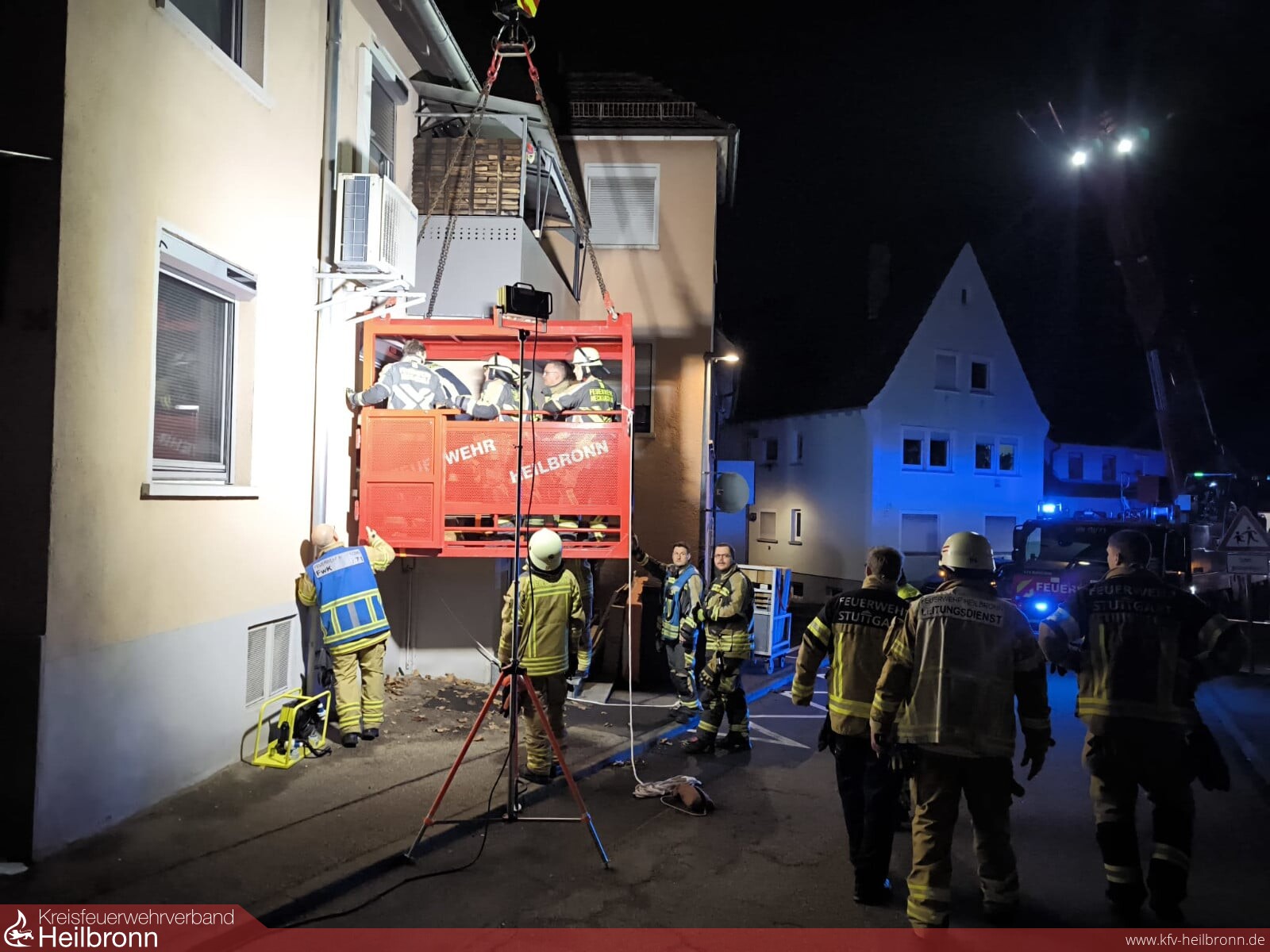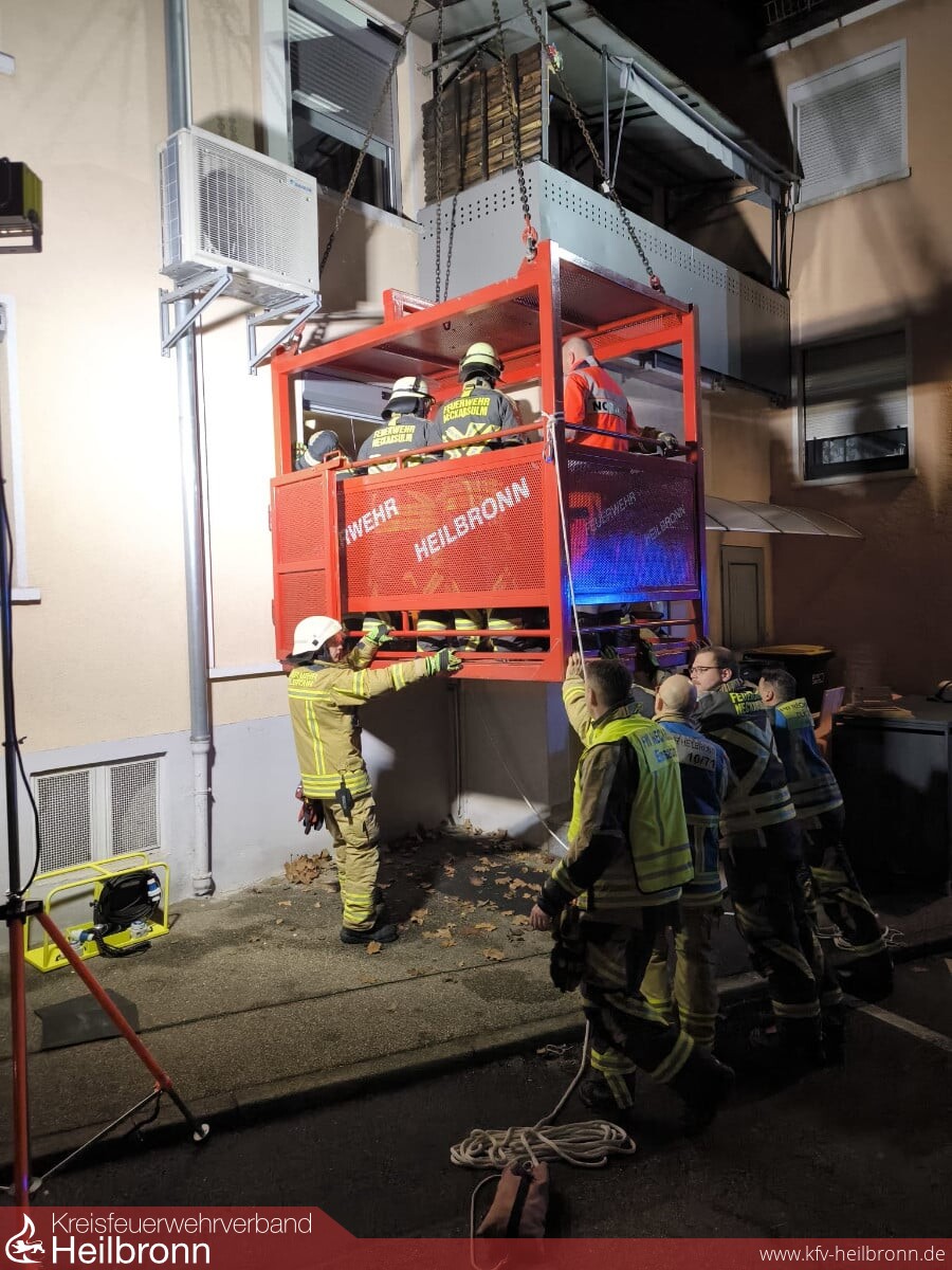 In enger Abstimmung mit den bereits anwesenden Kräften des Heilbronner Schwerlastrettungswagens sowie eines Notarzteinsatzfahrzeuges wurde nach erster Lageerkundung aufgrund der baulichen Gegebenheiten, wie aber auch der Grenzen der vorhandene Einsatzmittel, der Feuerwehrkran der Berufsfeuerwehr Heilbronn und für den weiteren Transport ein spezieller Großraumrettungswagen der Berufsfeuerwehr Stuttgart nachalarmiert.