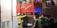 Ein Holzunterbau, um die Person mittels Schwerlastschleifkorbtrage durch das Fenster in den bereit hängenden Rettungskorb zu bringen, wurde im Gebäude wie auch außerhalb im Rettungskorb hergestellt.