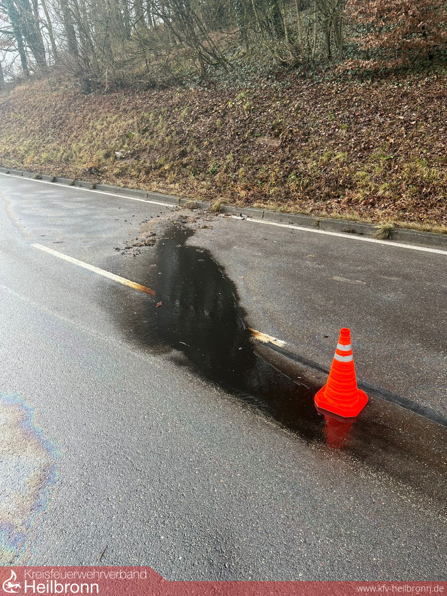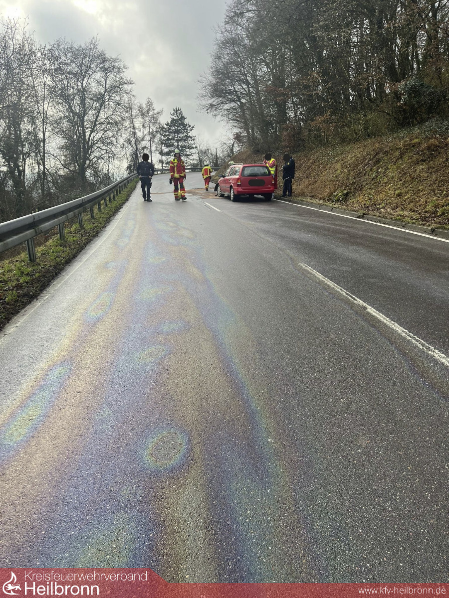 Nach einem Verkehrsunfall ohne Fremdbeteiligung waren Öl und Benzin des Unfallfahrzeuges ausgetreten und großflächig auf der K2156 in Richtung Allfeld verteilt.