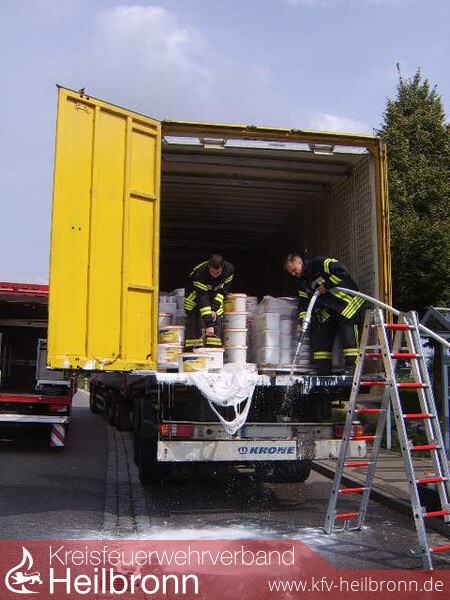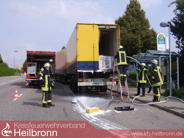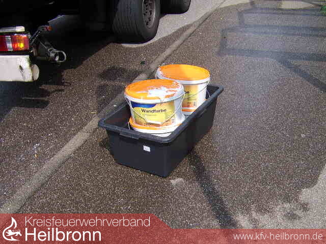 Ein in einer Bushaltestelle stehender LKW verlor aus dem Laderaum weiße Dispersionsfarbe. Nach Abklärung mit der Kläranlage durch die Integrierte Leitstelle wurden aufgrund der geringen Menge und Umweltungefährlichkeit Ladefläche und Straße mit Wasser gereinigt. Die so verdünnte Farbe konnte somit problemlos der Kanalisation zugeführt werden. Die beim Transport beschädigten Farbeimer wurden in Wannen verlastet und der Spedition wieder mitgegeben.