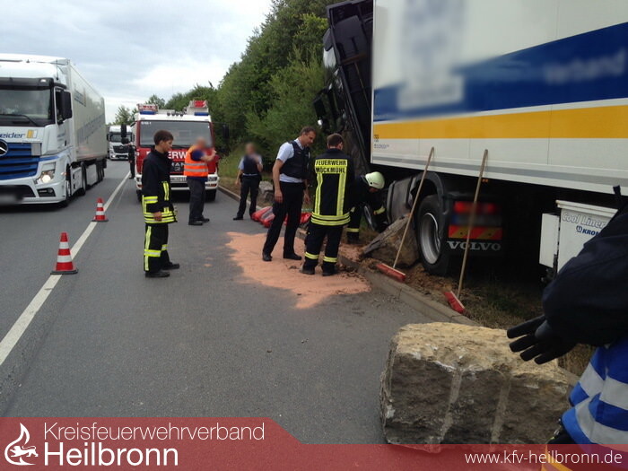 Vermutlich durch Unachtsamkeit, kam der Fahrer eines Sattelzuges noch im Ausfahrtsbereichs des DLZ nach rechts von der Fahrbahn ab, überrollte einige Steinquader, welche zur Abgrenzung der Fahrbahn abgelegt waren und riss dabei seinen kurz zuvor gefüllten Tank an mehreren Stellen auf.
