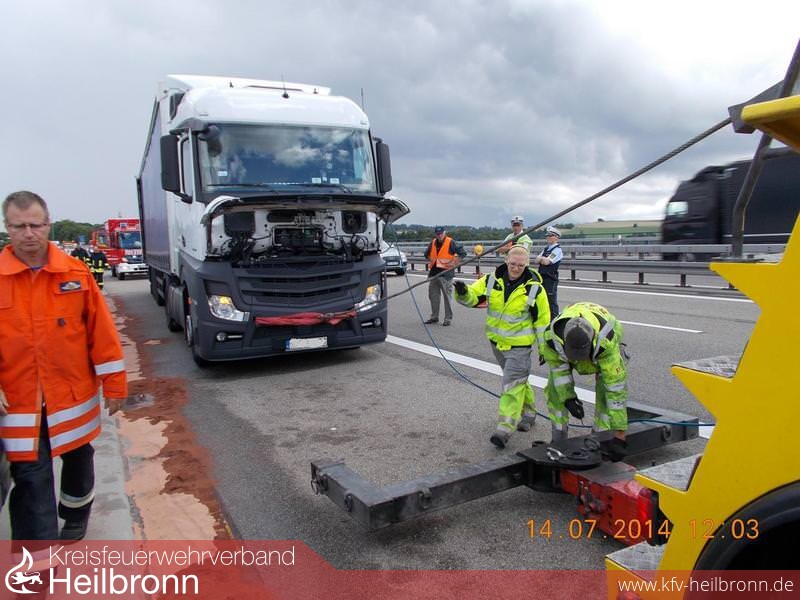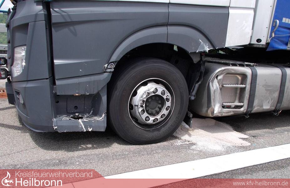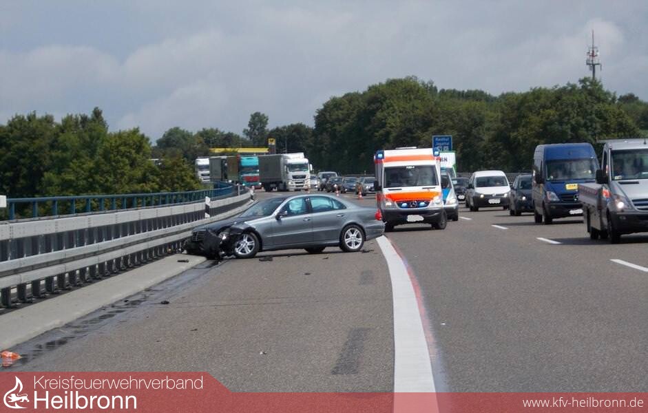 Auf der Jagsttalbrücke kam es zu einem Zusammenstoß zwischen einem PKW und einem LKW. Ein Mercedes war aus ungeklärter Ursache ins schleudern geraten und kollidierte mit dem Sattelzug.