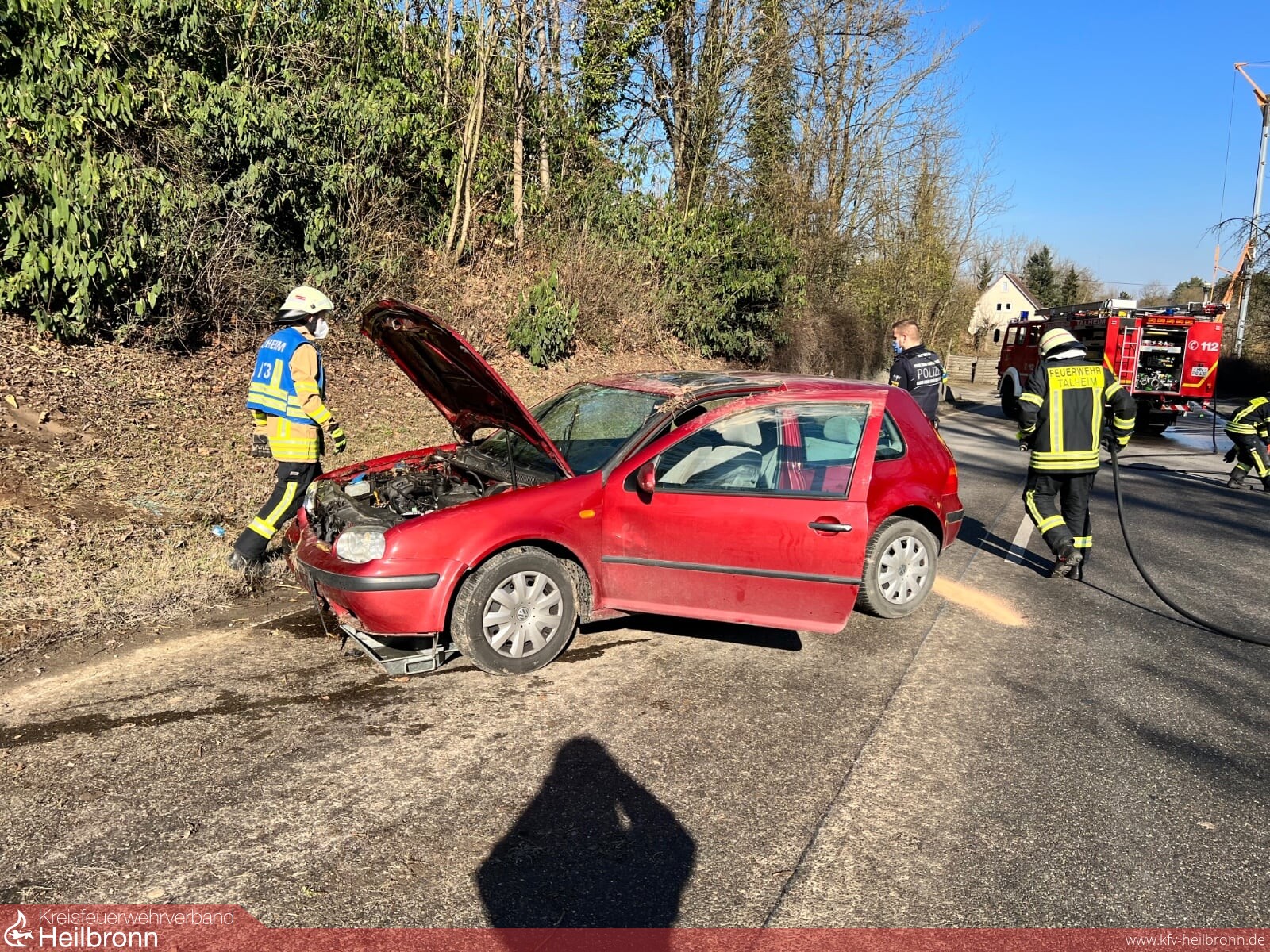 Nach einem Verkehrsunfall traten Betriebsstoffe an einem VW Golf aus. Die Insassen des Fahrzeugs hatten den Wagen schon selbstständig verlassen und wurden vom Rettungsdienst versorgt.