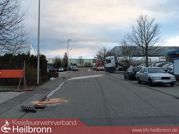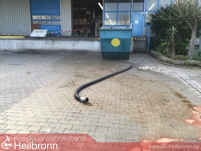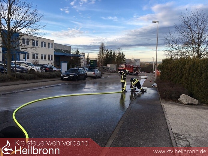 Bis zum Eintreffen des ersten Fahrzeuges waren inzwischen ca. 200 Liter Flüssigkeit ausgetreten und flossen über den Betriebshof hinaus auf die Straße. Die genaue Zusammensetzung der Flüssigkeit war unklar was den Einsatzleiter der Feuerwehr Talheim dazu veranlasste über die Integrierte Leitstelle Heilbronn den Fachberater Chemie hinzu zu ziehen, da es sich augenscheinlich um einen Gefahrstoff handelte. Bis auf weiteres wurde die Einsatzstelle Großflächig abgesperrt und die betreffende Halle geräumt. Ebenfalls wurde die Kläranlage Heilbronn über den Zwischenfall informiert so dass Sie die richtigen Vorkehrungen treffen konnten.