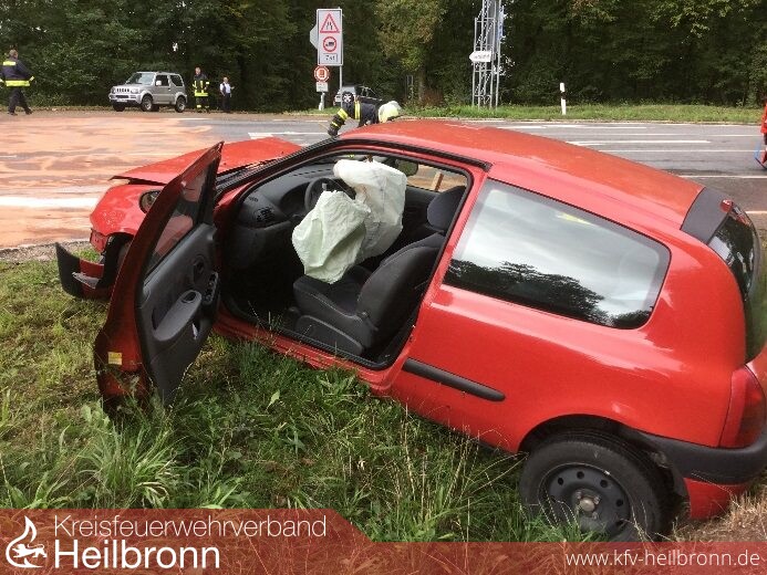An der Waldkreuzung zwischen Talheim und Untergruppenbach kam es zu einem Unfall zwischen zwei Fahrzeugen im Kreuzungsbereich. Ein aus Richtung Talheim kommender BMW hatte beim Überqueren der Kreuzung ein aus Ilsfeld kommenden Renault übersehen. Infolge dessen hat der Renault den BMW in der Kreuzung an der hinteren Rechten Türe getroffen.