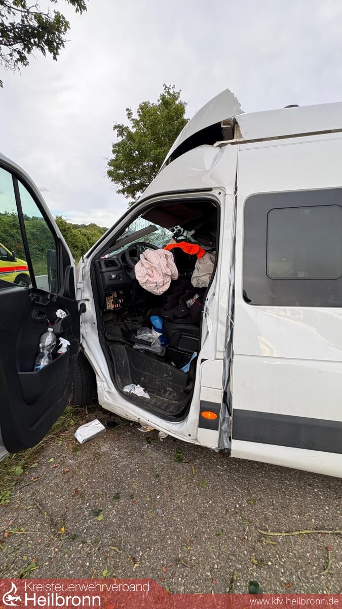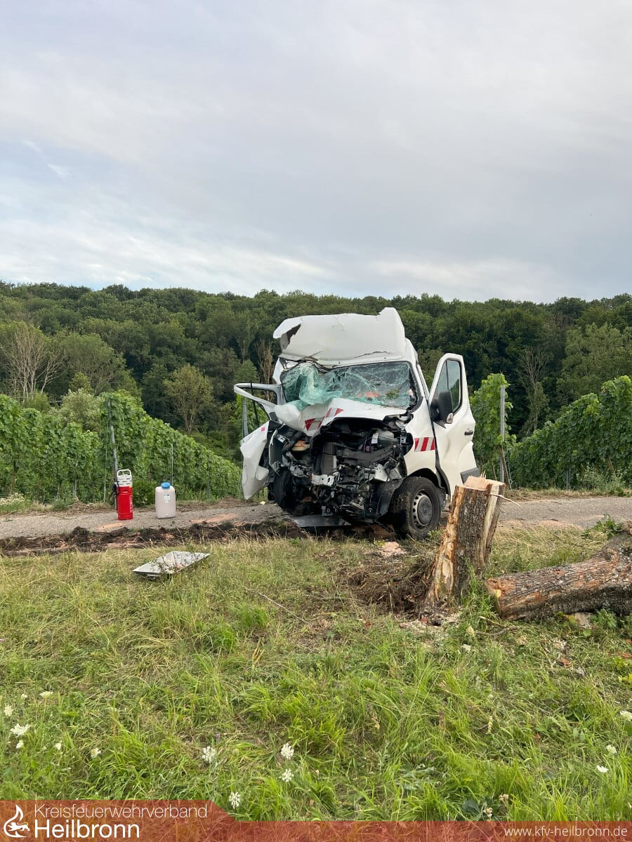 Ein weißer Sprinter war aus bislang ungeklärter Ursache in Fahrtrichtung Talheim von der Fahrbahn abgekommen. Das Fahrzeug kollidierte frontal mit einem am Fahrbahnrand stehenden Baum und kam schließlich wenige Meter weiter in einem angrenzenden Weinberg zum Stillstand. Beim Eintreffen der Feuerwehr hatte der Fahrer das stark beschädigte Fahrzeug bereits eigenständig und weitgehend unverletzt verlassen und wurde durch den Rettungsdienst betreut.
