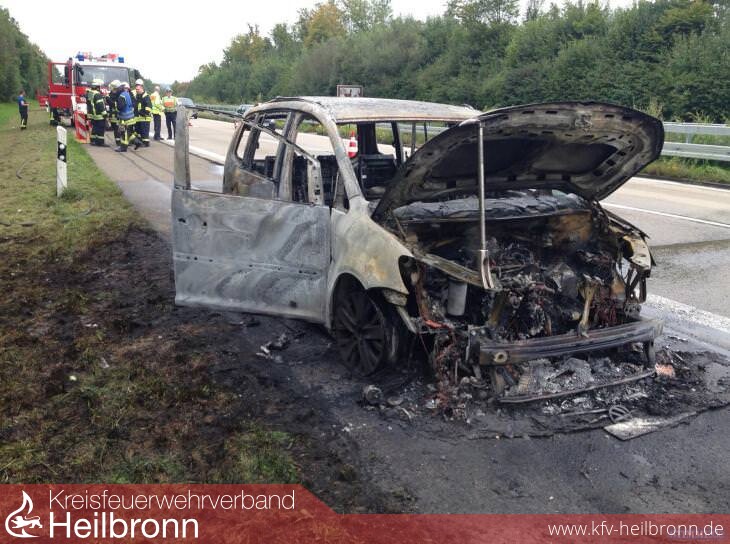 Am Montag, gegen 13.30 Uhr, waren Polizei und Feuerwehr auf der Autobahn 81 bei Neuenstadt im Einsatz. Auf dem Streckenabschnitt zwischen Tunnel Hölzern und dem Kreuz Weinsberg in Fahrtrichtung Stuttgart hatte der VW Touran eines Verkehrsteilnehmers plötzlich Feuer gefangen und brannte lichterloh. Nachdem der Autofahrer vergeblich versucht hatte, den Fahrzeugbrand mit einem Feuerlöscher zu bekämpfen, rückte die Feuerwehr an. Während des Einsatzes musste der Autobahnabschnitt für etwa eine halbe Stunde voll gesperrt werden. Dadurch entstand zwischen den Anschlussstellen Neuenstadt und Tunnel Hölzern ein Rückstau von mehreren Kilometern. Der entstandene Sachschaden ist noch nicht bekannt. Verletzt wurde bei dem Feuer niemand.